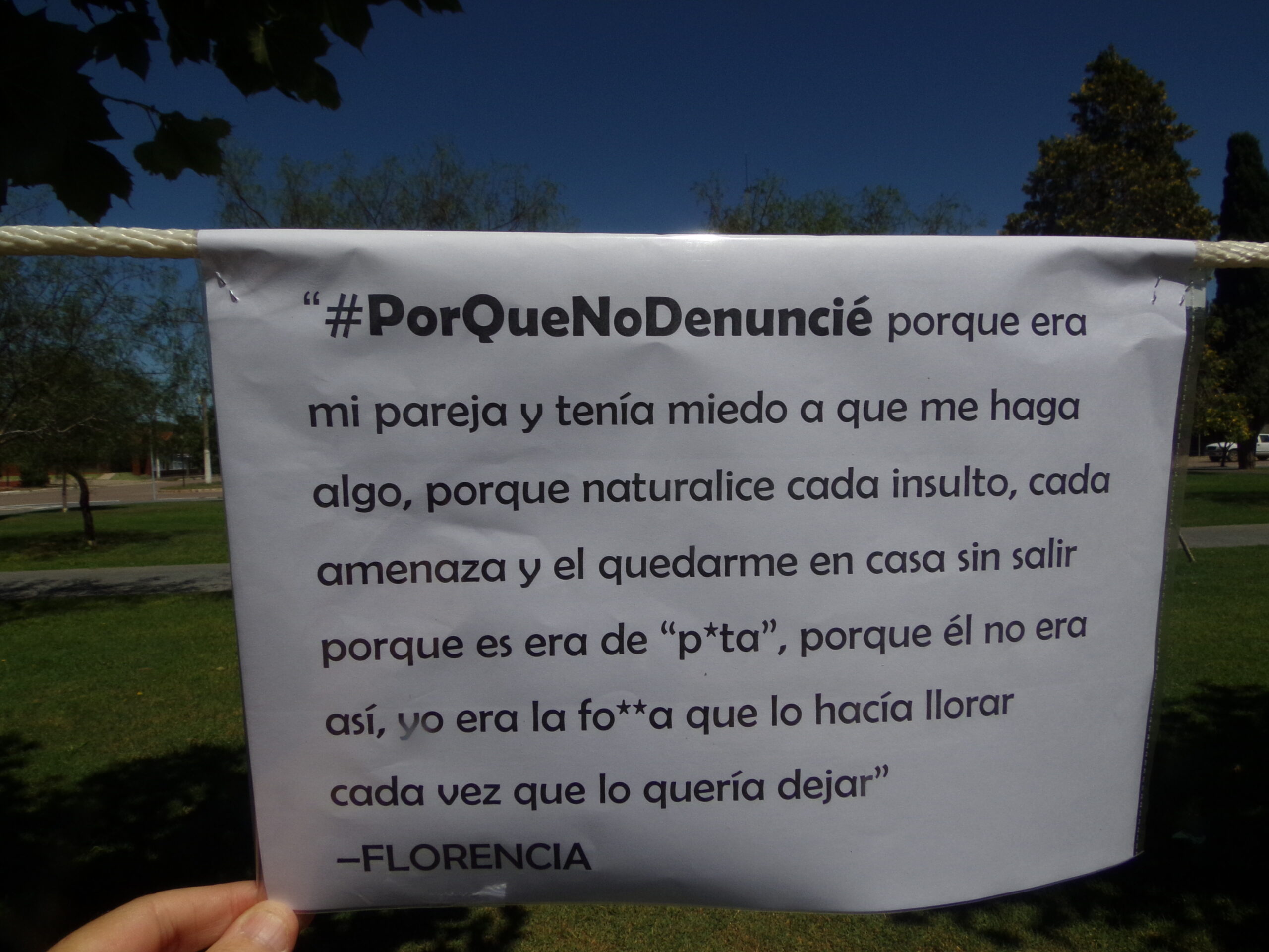 También en toda la plaza se colocaron carteles con la consigna: “¿Por qué no denuncié?” para denotar la importancia de denunciar los casos de violencia de género ya que estos delitos no solo permiten el castigo al agresor y la salida de la víctima de la situación violenta, sino que benefician a la sociedad permitiendo nominar la violencia. Al respecto señalaron que muchas mujeres no denuncian estas situaciones porque no identifican el maltrato como tal. Y es a partir de estas denuncias que la situación puede cambiar.