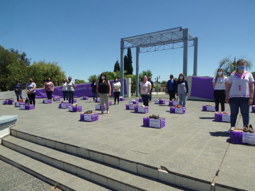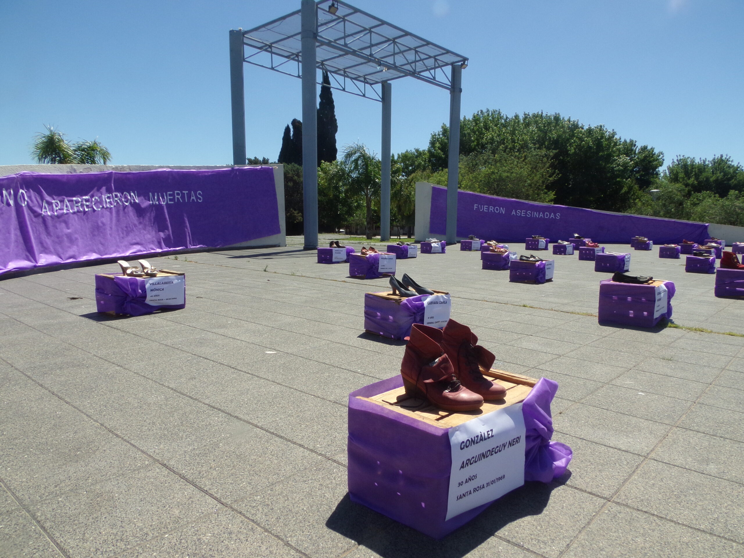 Las mujeres colocaron cajones violetas -color que representa la lucha de las mujeres- y encima tienen calzado de dama y en las paredes del anfiteatro la frase «No aparecieron muertas, fueron asesinadas». Esta intervención es una réplica de la realizada por Bancá Intervenciones Artísticas Callejeras de La Pampa en el año 2018 inspirada en la muestra de la artista mexicana Elina Chauvet denominada «Zapatos Rojos».