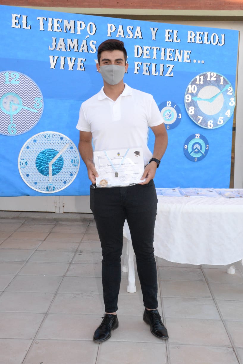 Asimismo, se le preguntó sobre si tuvieron exámenes finales. Al respecto respondió que «en muchas materias hubo una evaluación final de carácter oral, no eran complicadas las evaluaciones porque básicamente era repasar lo que habíamos hecho durante el año». Todo de manera virtual. «En noviembre rendí las últimas materias y no me quedaron pendientes», señaló. El 11 de diciembre fue el acto de colación, al aire libre y con protocolos. Ese día marcó el reencuentro de la totalidad de la promo 2020 después de meses sin verse de manera presencial.