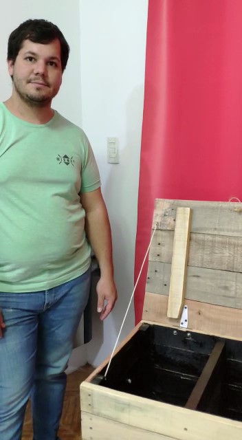 Los materiales que utiliza son tablas de madera de pallets de productos alimenticios, que por lo general nunca se les da otro uso, en cambio el emprendedor las reutiliza. Las composteras miden 60 centímetros de alto y de ancho y 45 centímetros de profundidad. «Por dentro las impermeabilizo con pintura asfáltica y por fuera en un momento había pensado en barnizarlas, pero mucha gente me ha pedido pintarlas con algún color, entonces las entregó lijadas y que el cliente le dé la terminación que quiera. A unos 12 centímetros de la parte inferior tienen una abertura con un tejido plástico o red que sirve más que nada para aireación, que tenga continuamente circulación de aire para que respire y le dé más oxigenación así los microorganismos y bacterias pueden trabajar bien en el proceso de compostaje», explicó con conocimiento.