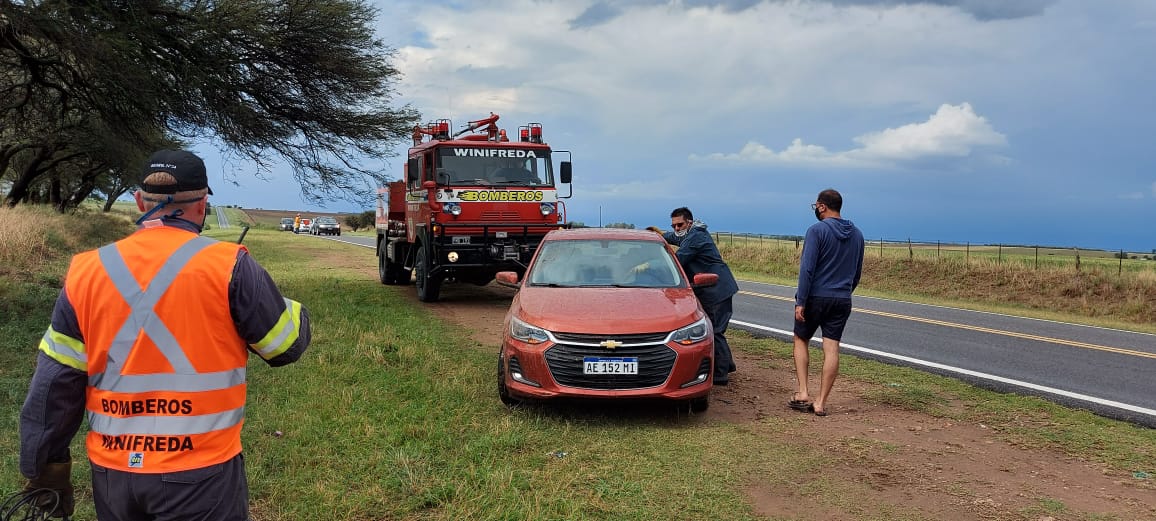Bomberos Voluntarios de Winifreda tuvieron que intervenir durante la tarde de hoy en un tramo de la ruta nacional 35. Allí una camioneta y un automóvil quedaron encajados en la banquina donde habían estacionado cuando se registraba un fuerte temporal de viento, lluvia y piedras.