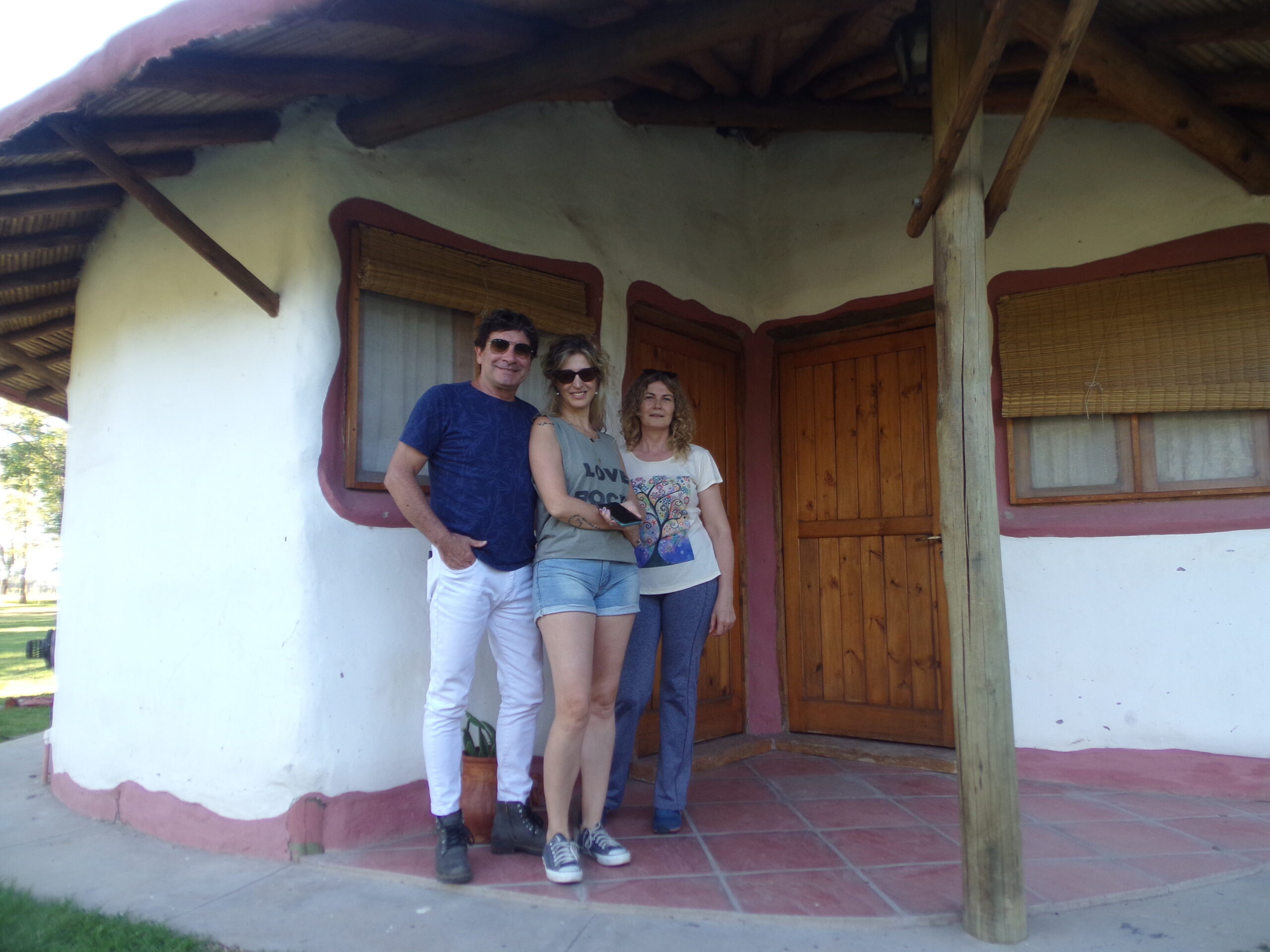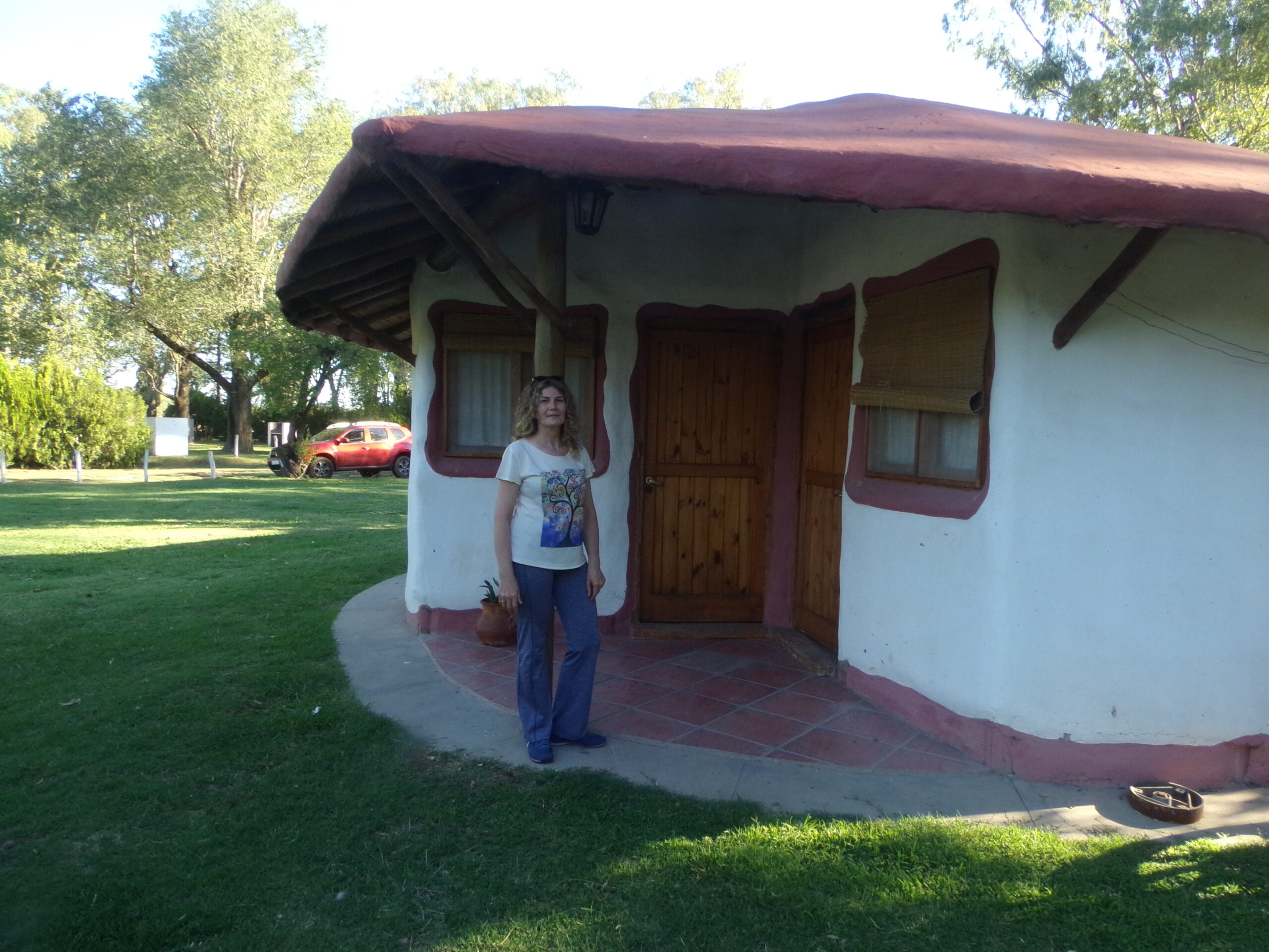 Llegó al predio comunal junto a su amiga, la escritora pampeana Patricia Lobos, y su esposo Rubén Gaite. Pudo observar el exterior de las edificaciones, pero no pudo ingresar adentro de los albergues porque desde hace un tiempo no prestan al pasajero el servicio de alojamiento y permanecen cerrados con llave. Igualmente quedó encantada con el formato que tienen.