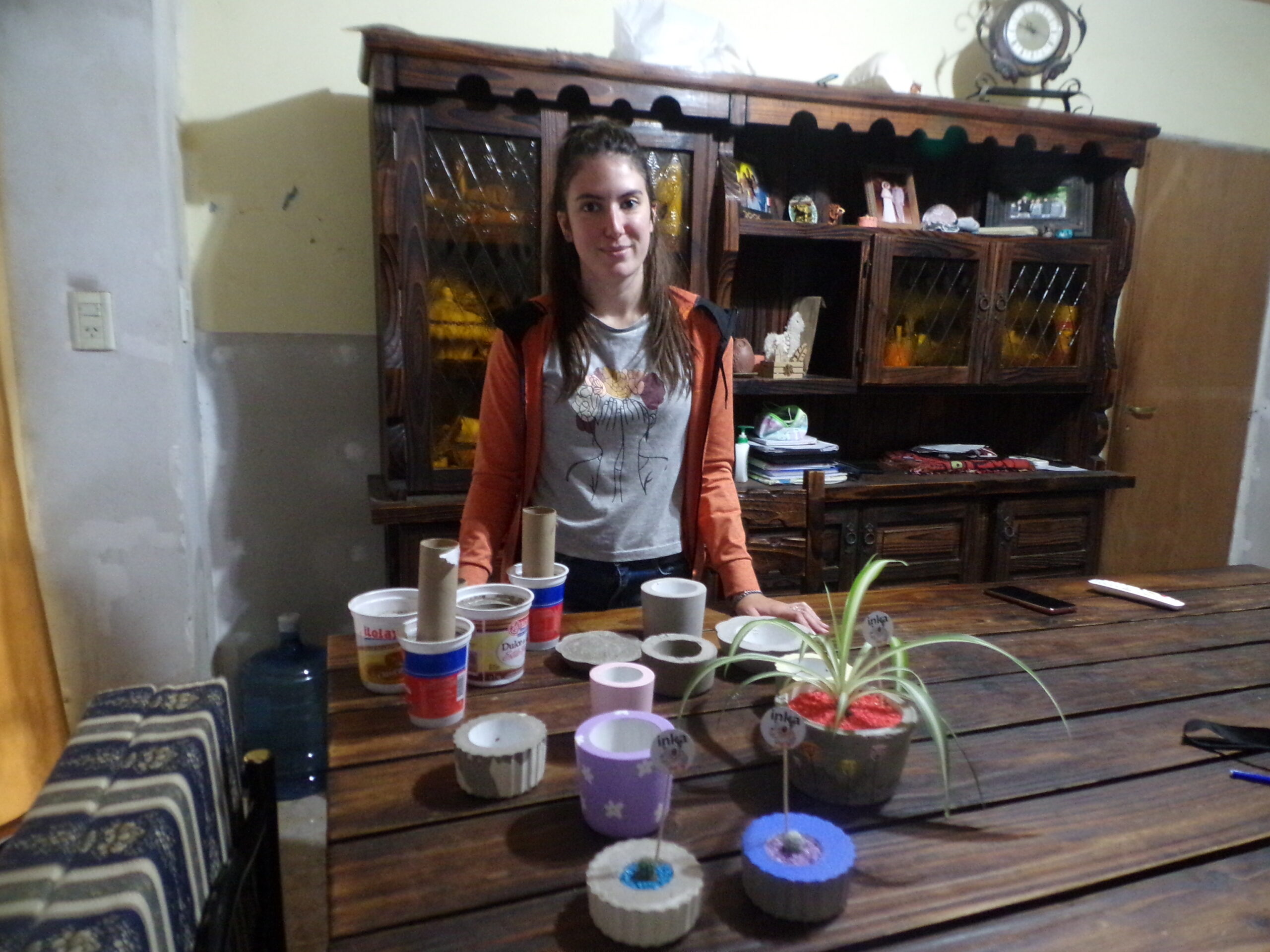 Sus recipientes son de tamaño reducido, ideales para cactus, suculentas o plantas para interiores. Los moldes que utiliza para dar forma al producto son residuos reutilizables como potes plásticos de crema, yogur, dulce de leche, envases de telgopor de helados y rollos de cartón. «Las macetitas no son cien por ciento de cemento porque se romperían, utilizo una proporción de cemento y arena para que sean resistentes y fuertes. Realmente da resultado. Me llevó varios meses aprender esta técnica hasta que le agarré la mano», comentó sobre el proceso de fabricación.