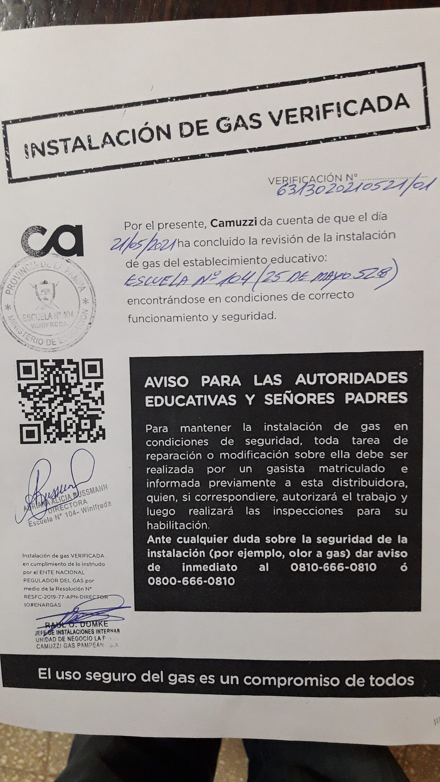 Al respecto, la directora de la institución Adriana Russmann, reveló que «desde el Ministerio de Educación nos exigen todos los años la revisión de todos los calefactores». Motivo por el cual durante la mañana del viernes llegó a la escuela el inspector de la empresa proveedora del fluido en territorio pampeano, Raúl Domke, para verificar «todo el trabajo» que hizo el gasista matriculado Néstor “Magu” Mayer. «Por una disposición del Enargas (Ente Nacional Regulador del Gas), Camuzzi tiene que inspeccionar todas las escuelas de La Pampa comprendidas en nuestro sector. Los matriculados ponen en condiciones las instalaciones, nos avisan y se supervisa», explicó Domke sobre la metodología utilizada. «En este caso, por ejemplo, quedó todo bien y dejamos un certificado donde queda avalado que la escuela está inspeccionada y en condiciones de uso», agregó.