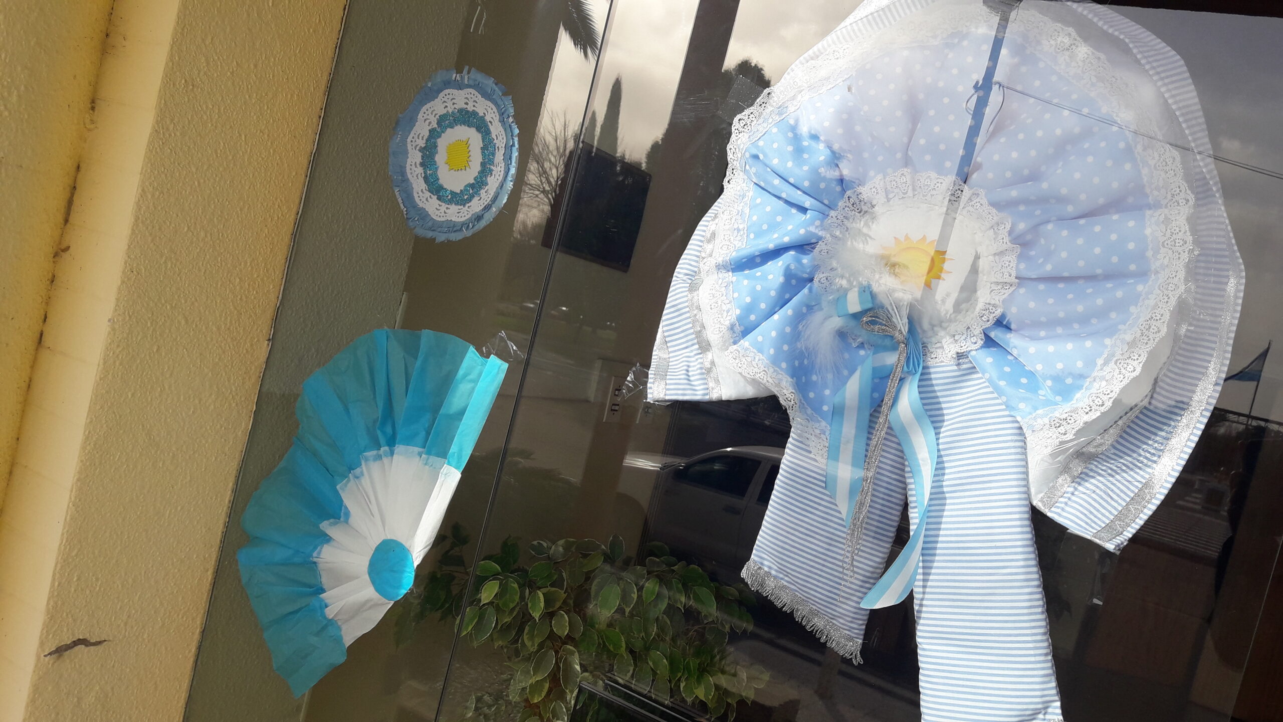 Las dos puertas vidriadas que permiten el ingreso al edificio municipal de la localidad están decoradas con escarapelas artesanales confeccionadas con materiales reciclables. Estas las realizaron numerosas familias desde sus respectivos hogares. Algunos winifredenses prefirieron evitar la circulación y directamente subieron sus creativas creaciones a las redes. De la actividad participaron niños, adolescentes y adultos.