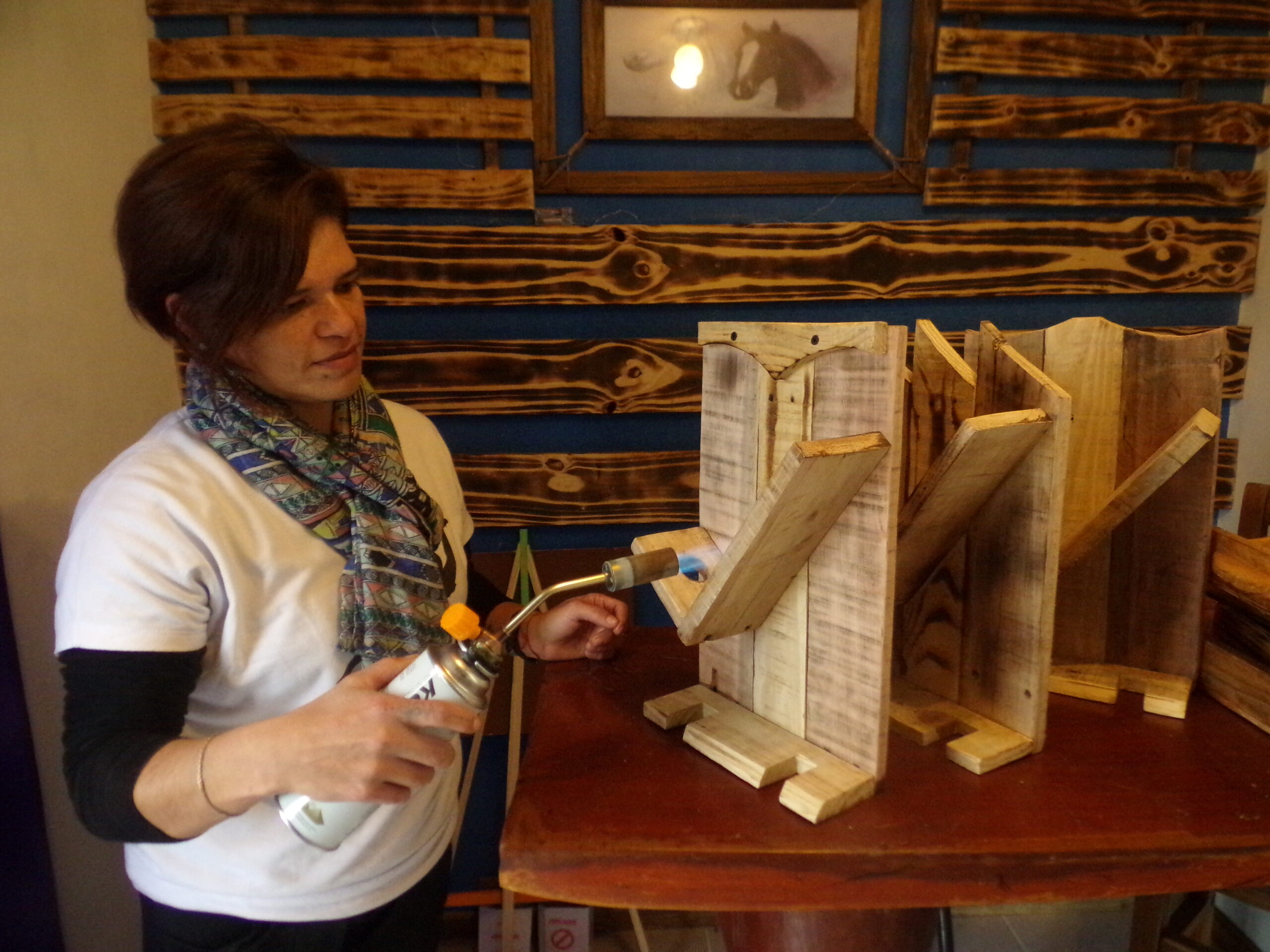 Para todo utiliza palets de madera. Los desarma, cura, recicla y le da valor agregado. Un proveedor local la abastece de esos armazones que ella compra a medida que los necesita. A la madera le realiza un tratamiento. «Lo primero que hago es limpiarla muy bien porque algunas son muy viejas, la curo con un remedio y después la quemo con un soplete a gas butano y la barnizo», detalló.