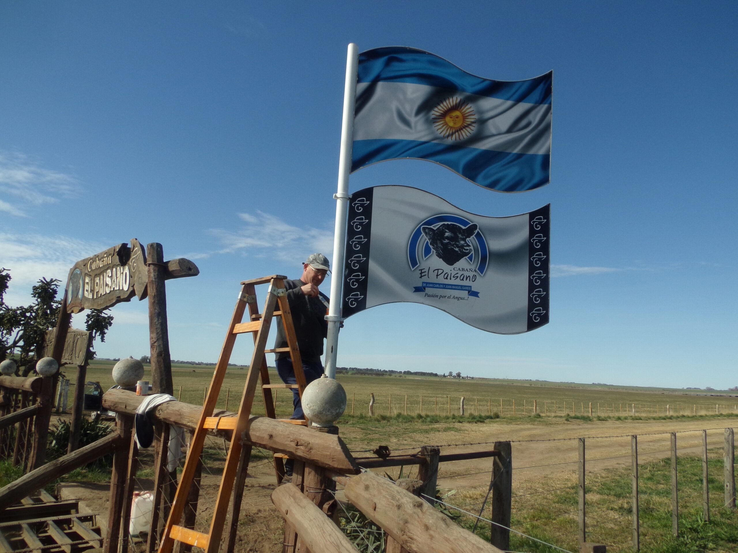 Los cabañeros apuestan por el mejoramiento genético y ahora decidieron renovar la estética del ingreso al establecimiento ganadero dedicado a la producción de vacunos de la raza Aberdeen Angus puros de pedigree y controlados. A simple vista la novedad que presenta es una especie de mástil con dos chapas galvanizadas recortadas en forma de bandera. Una está pintada con los colores del pabellón nacional y la otra con el isologo de la cabaña. El cartel de madera con su nombre, los postes que lo sostienen y los aledaños también serán pintados. De esta manera, esto hará más notable su identificación. Los trabajos de coloración y puesta en valor son responsabilidad del trabajador Mariano Selinger de Mauricio Mayer.
