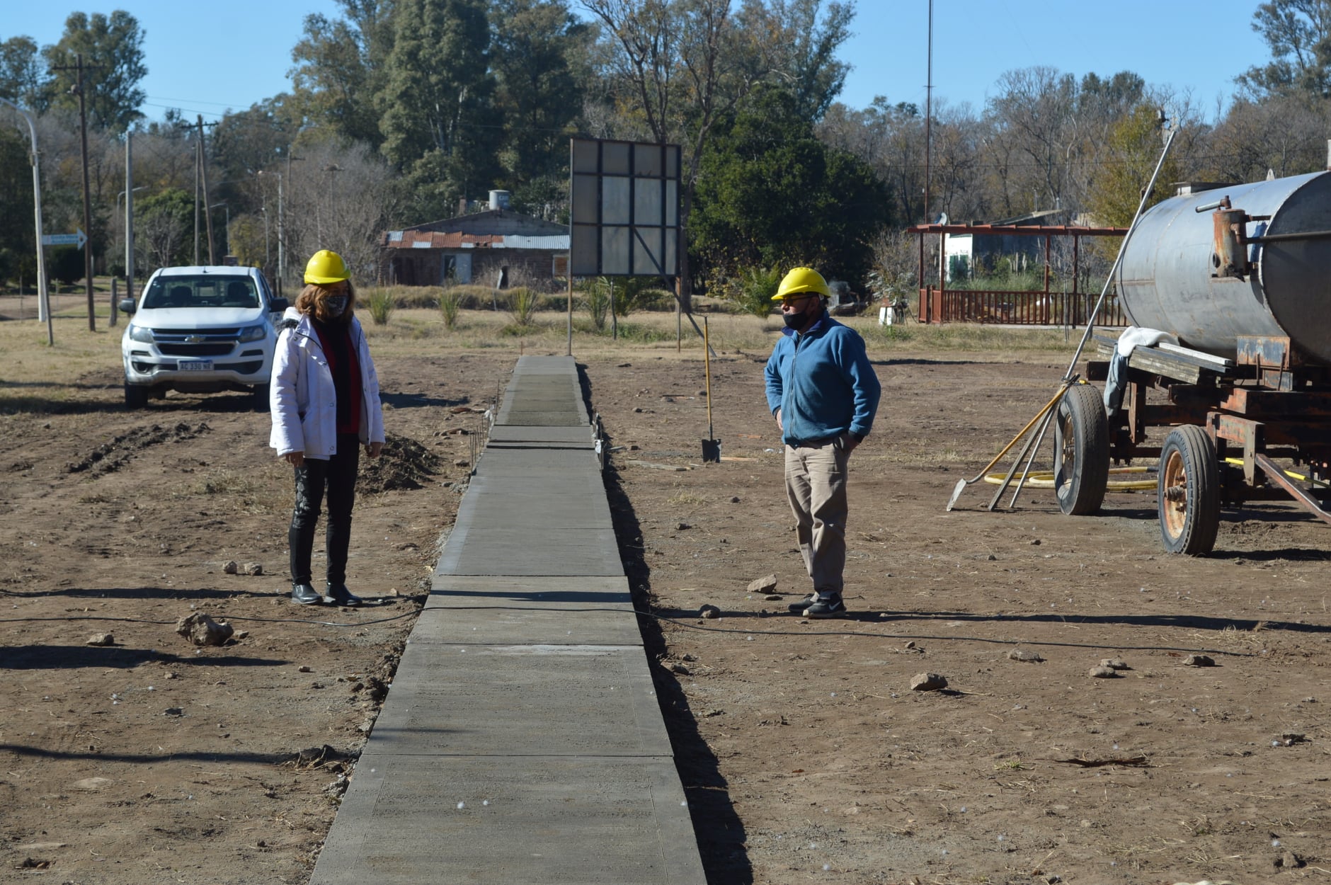 Los materiales e insumos para la realización de veredas fueron comprados por el municipio en partes iguales a comercios del rubro construcción locales con licencia municipal activa. De esta manera, el 31 de mayo se dio comienzo con la ejecución de obra. Primeramente, empleados municipales limpiaron la parcela, nivelaron su superficie con camionadas de tierra y la levantaron unos 40 centímetros. Actualmente, la empresa continúa con la etapa de construcción de veredas, contando con un avance físico del 25 % sobre el total del proyecto.