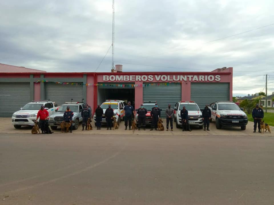 Binomios (bomberos y canes) posan frente al Cuartel de Bomberos de Miguel Riglos