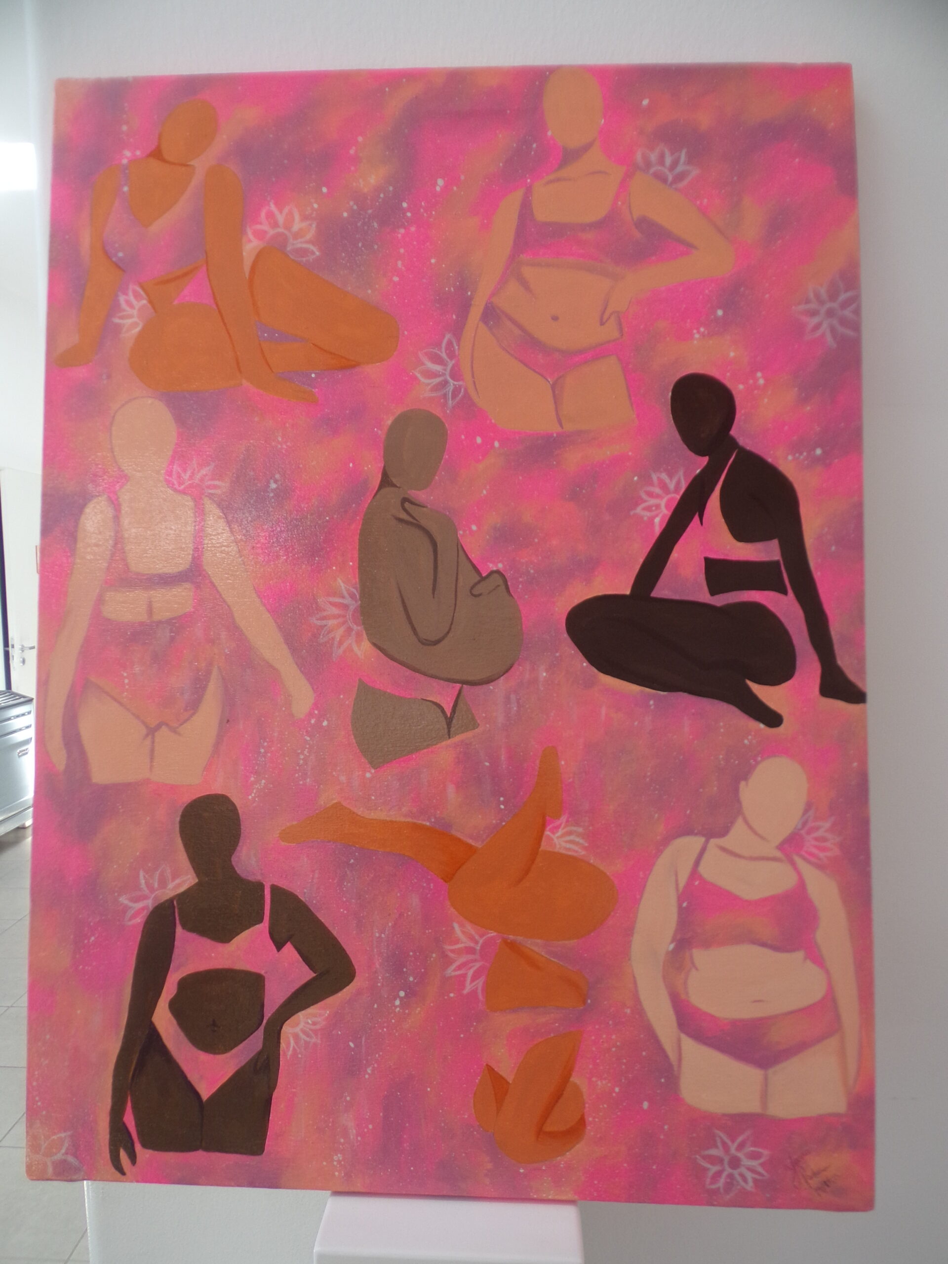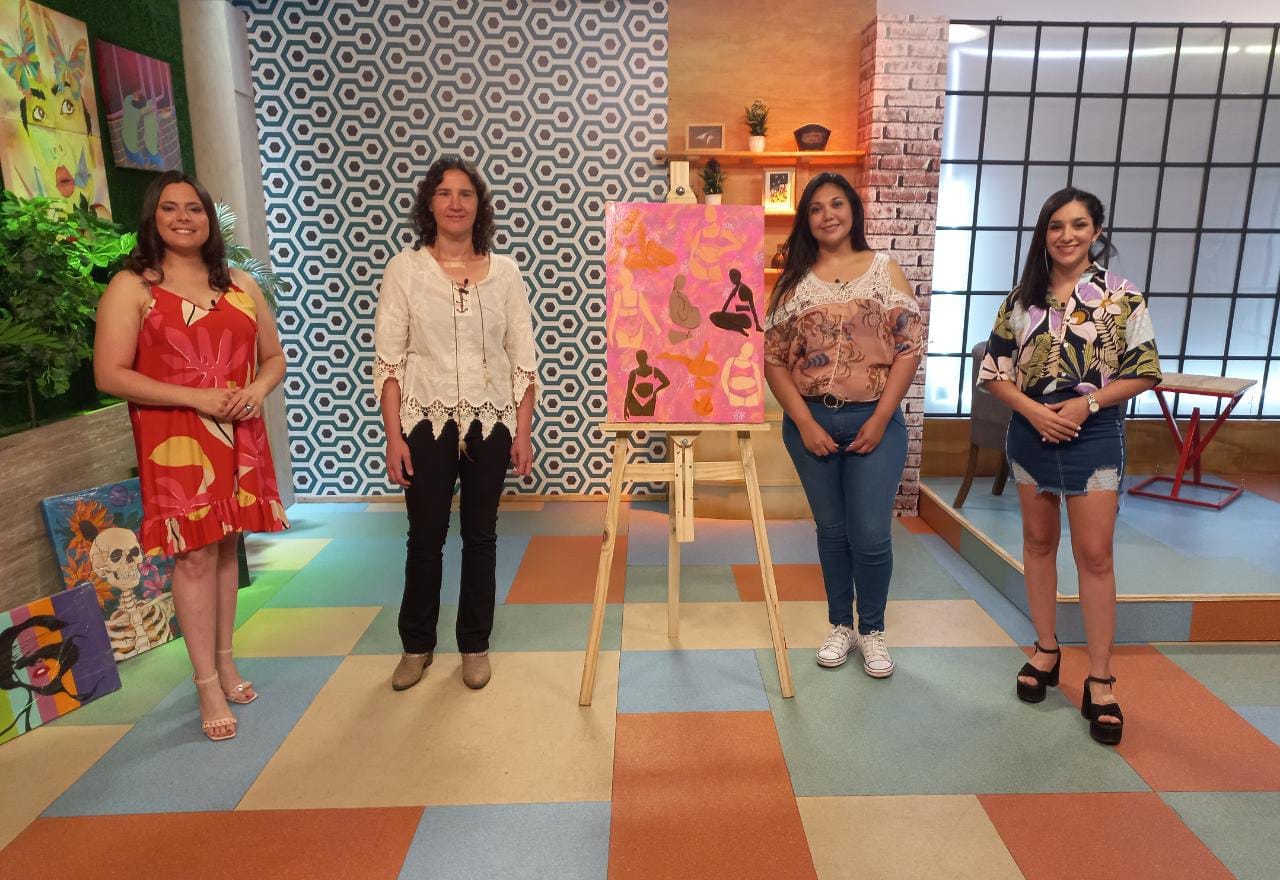 Hace unos días fue invitada al programa “Encuentro de Tarde”, que se emite de lunes a viernes por la Televisión Pública Pampeana con la conducción de Lujan Fischer – oriunda de Winifreda- y Sofía Wilches. La artista comenzó a pintar su cuadro el lunes y lo terminó el viernes demostrando su gran talento. Ese día se lo entregó a la doctora Daiana Lebed ante las cámaras de TV. «La propuesta era pintar una obra de arte a elección mía para ser donada a un centro de salud. En el cuadro plasmé algo que realmente me representa como el amor propio. Si bien elegí figuras de cuerpos femeninos el amor para mí no tiene género y no hay cuerpos únicos, todos son bellos», explicó el contenido de su obra.
