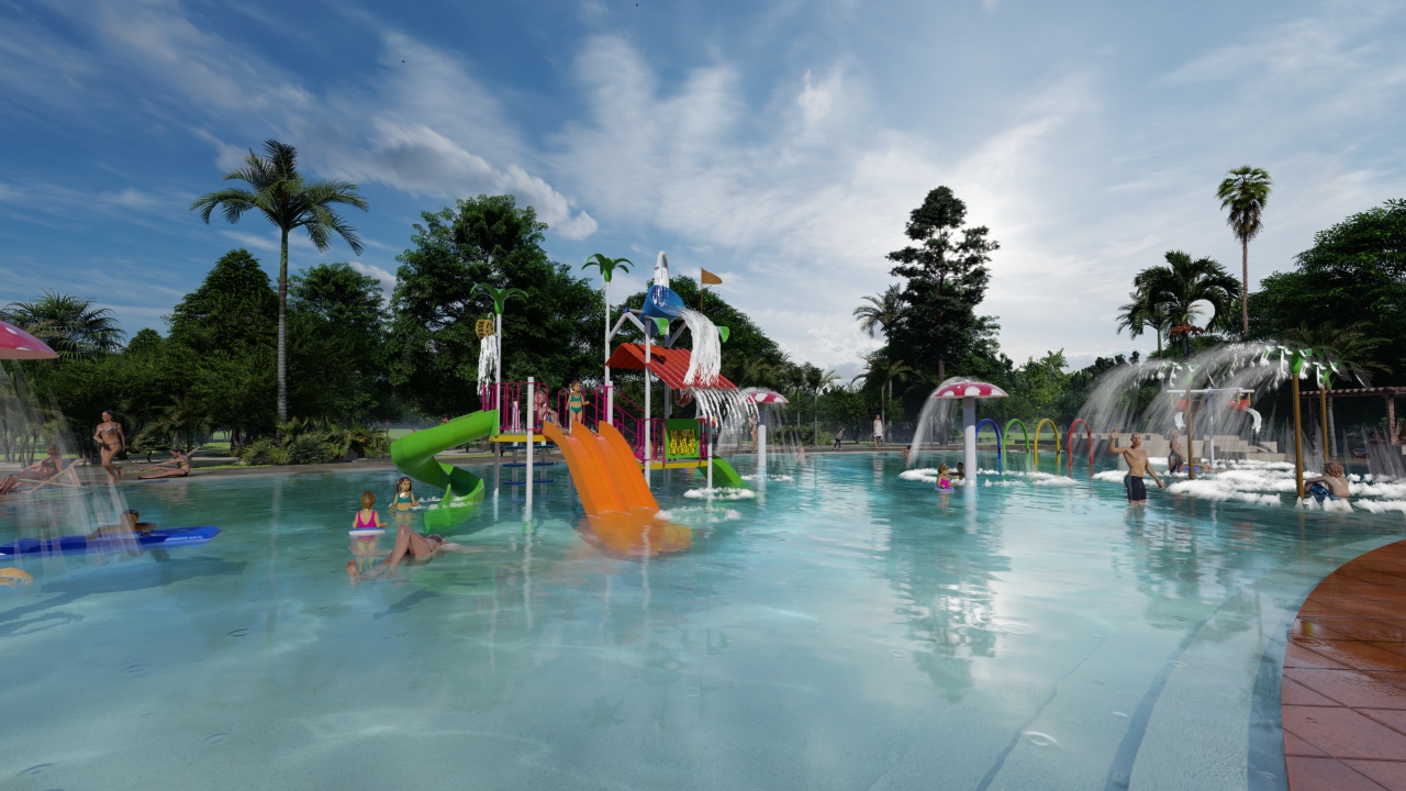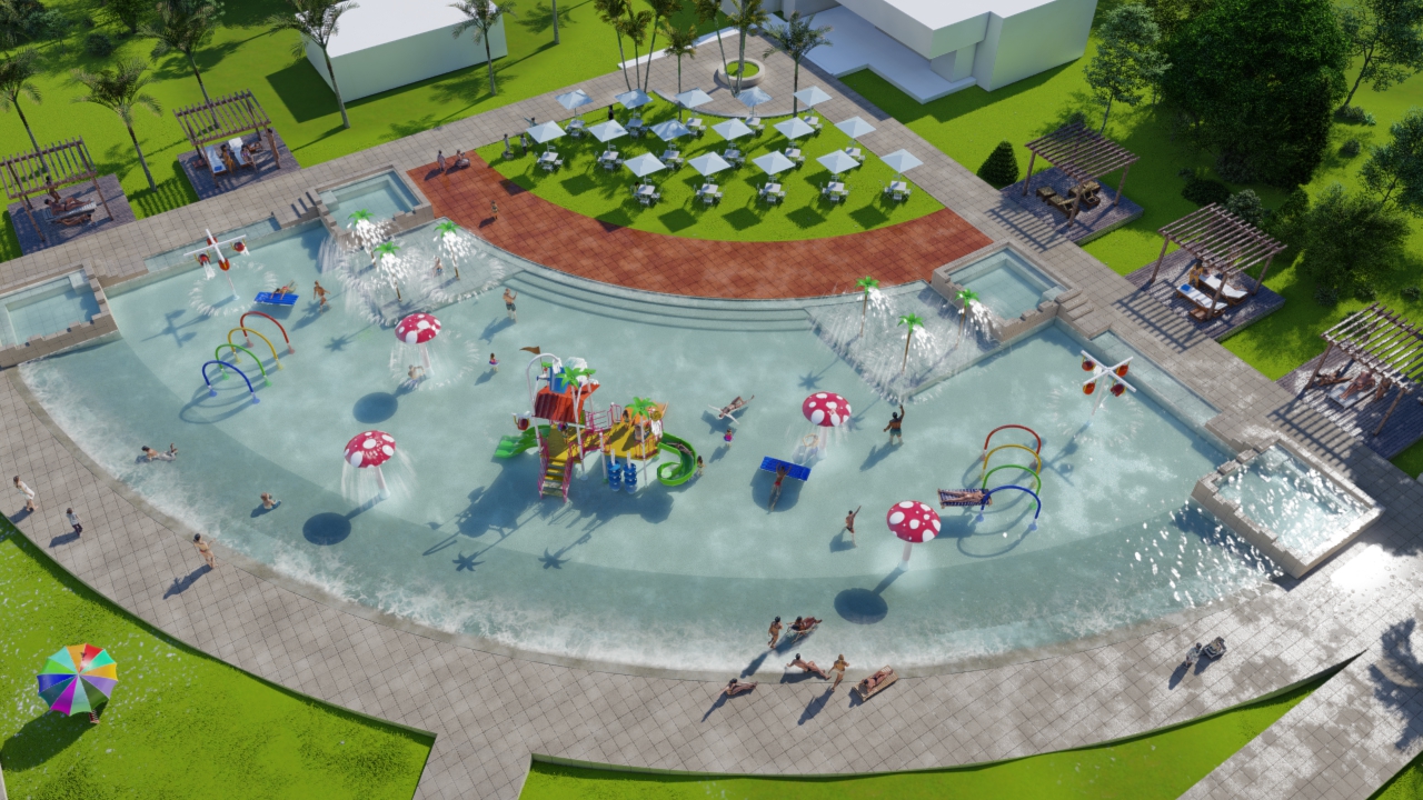 Estará coronado con una serie de juegos acuáticos infantiles que ya fueron comprados. Se destacarán un mangrullo con toboganes, un balde volcador de agua de 3 metros de alto, seis palmeras aspersoras, dos túneles aspersores, cuatro hongos lanza agua y dos calesitas con cuatro baldes volcadores de agua cada una. Varios ya están colocados.