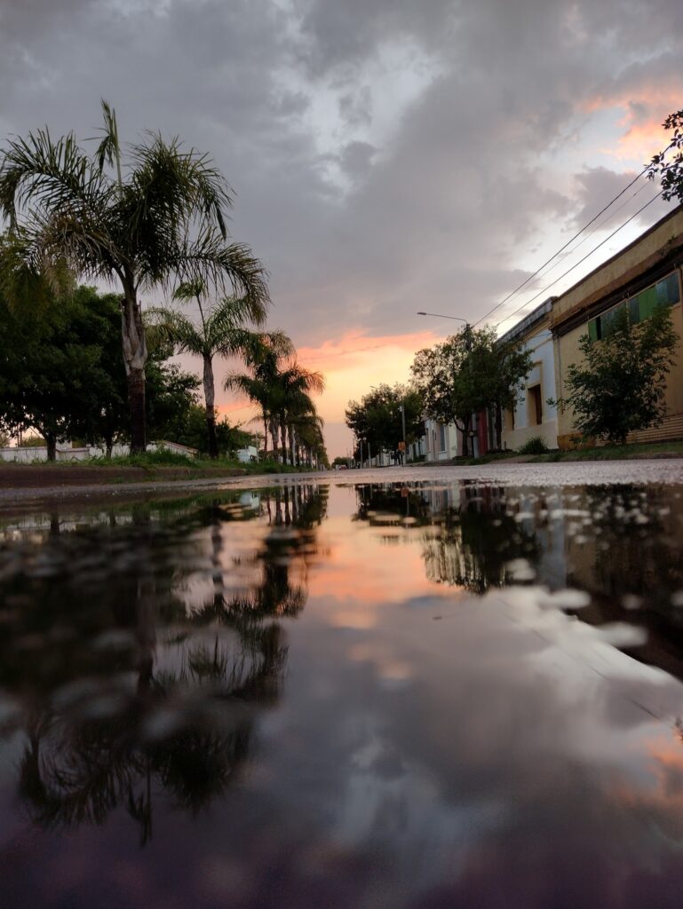 El trabajador municipal Denis Grosky subió a las redes una hermosa fotografía de las palmeras plantadas en la avenida central reflejadas en un charco de agua formado en el pavimento, el resto de la vegetación humedecida y el cielo color plomizo. Su postal es un testimonio de una llovizna que nadie esperaba, pero que fue bienvenida.