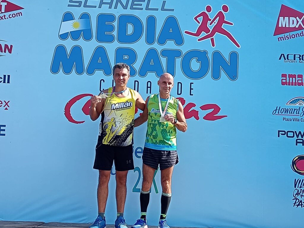 FOTO central: Diego Platner (izquierda) y Claudio Feininger con medallas tras correr la Media Maratón.