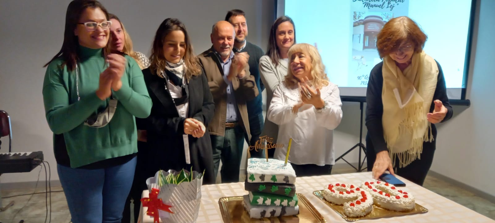 En el final, la comisión directiva procedió al corte de la torta aniversario donada por la vecina Silvia Giménez. Tenía forma de libro y los números del aniversario.