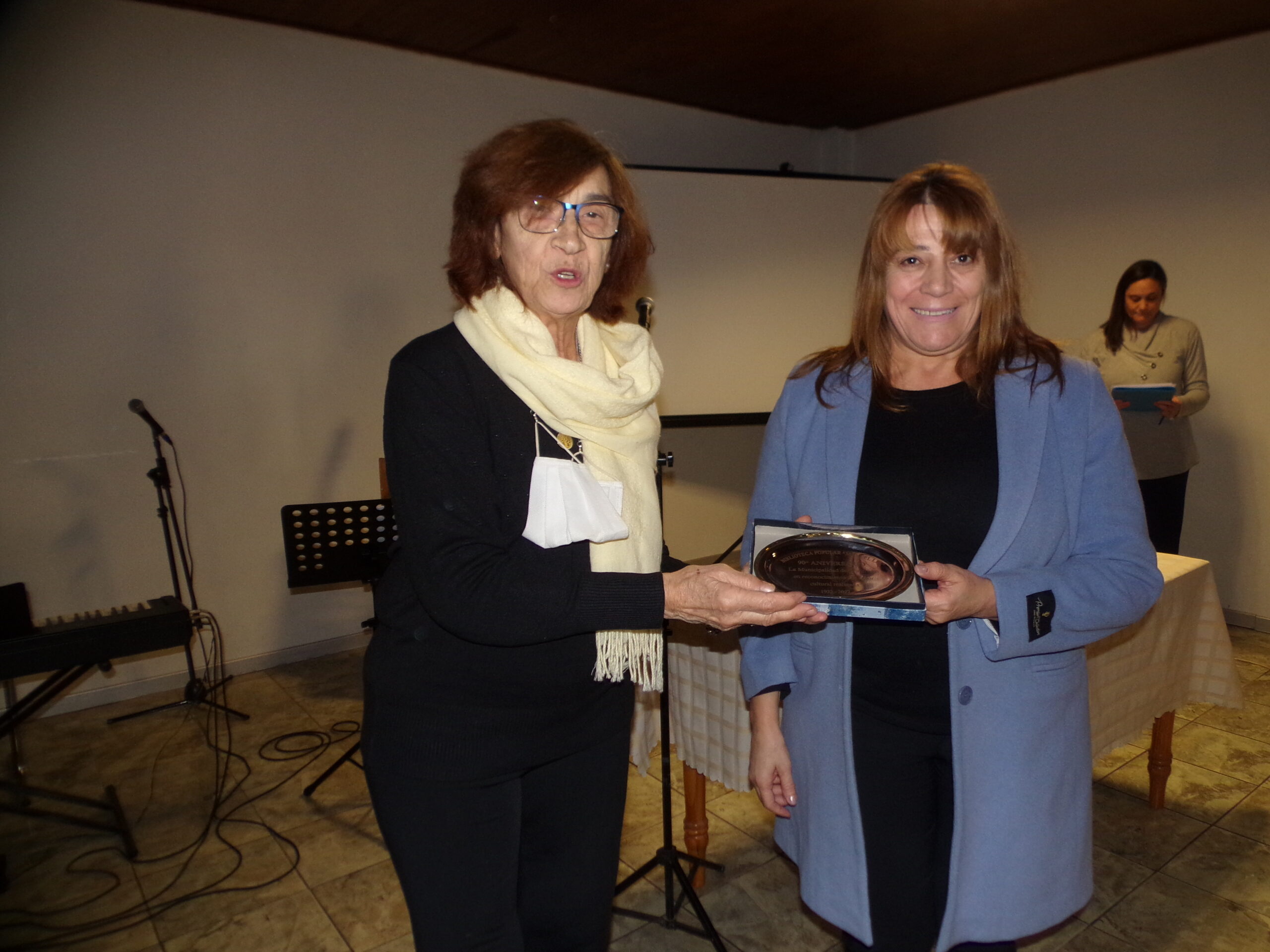 Otro momento emocionante fue cuando la vecina Alicia Alzamendi recibió un reconocimiento por sus 30 años de servicio como bibliotecaria de la institución, tarea que desempeñó hasta su jubilación. El presente se lo entregó su sucesora Elcira López con sus ojos llenos de lágrimas. Previamente, la locutora dio lectura a un mensaje de María Graciela Prieto para Alzamendi. «Querida Alicia, colega y amiga. Quiero acompañarte en este día especial en que la biblioteca popular cumple 90 años de los cuales los últimos 30 fuiste una parte importante en su crecimiento y modernización. Cumpliste tu rol de bibliotecaria con compromiso y dedicación. Recuerdo cada uno de los objetivos que te proponía la comisión directiva y vos estabas siempre firme y dispuesta a poner el hombro. Fue un placer acompañarlos en cada etapa. Un gran abrazo bibliotecario para vos, comisión directa y Elcira que sigue tus pasos», reza el texto de quien estuvo en el área de Bibliotecas Populares de la Secretaría de Cultura provincial.