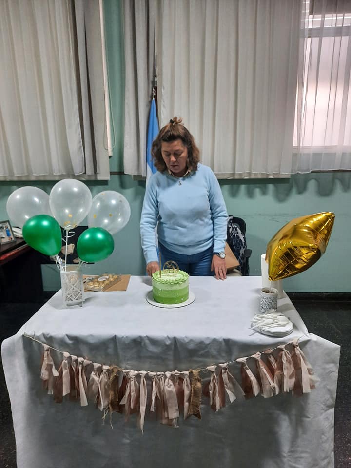 Ayer, antes de las 8 de la mañana, llegó a su lugar de trabajo. La puerta de su oficina estaba cerrada con llave. La secretaria Tesorera, el secretario de Producción y otros funcionarios se pusieron a conversar con ella sobre temas de gestión. Hasta que en determinado momento le dijeron que podía ingresar a su despacho. Y cuando lo hizo se encontró con que estaba adornado con globos y con el personal administrativo, de maestranza y el capataz municipal en representación de los trabajadores de calle que la esperaban para festejar sus seis décadas. Al unísono le cantaron «Que los cumplas feliz». La saludaron afectuosamente, le regalaron una torta y la filmaron cuando la cortaba.