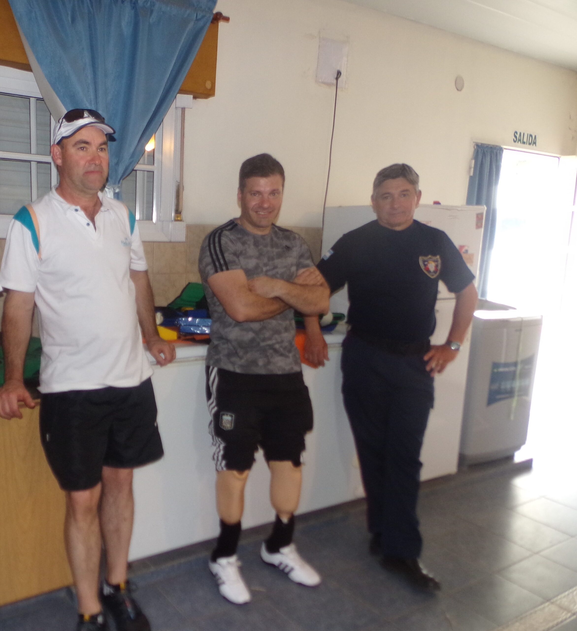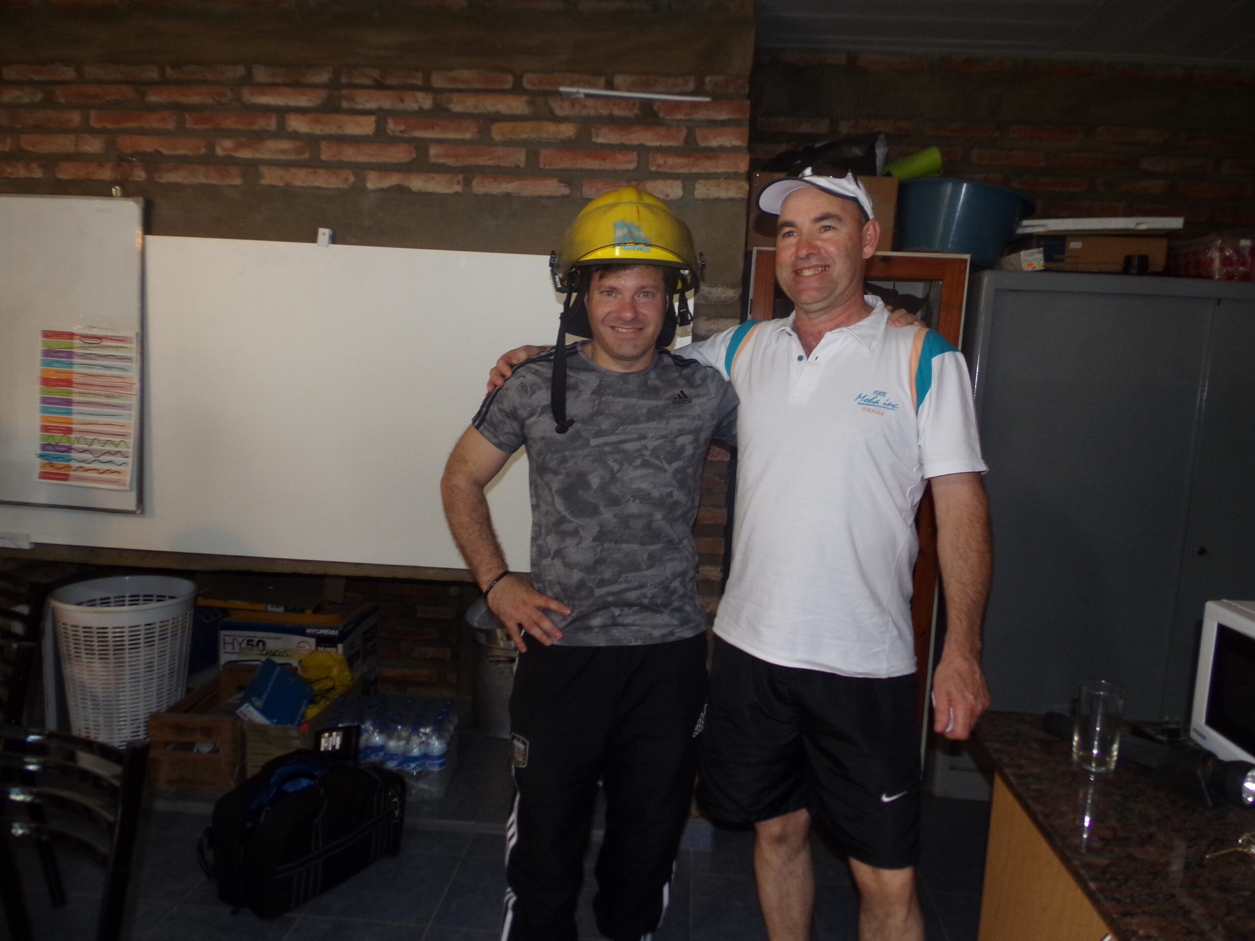 FOTO: Pablo Giesenow en el cuartel de Winifreda junto a Sergio Ressler y el bombero Juan Schiebelbein.