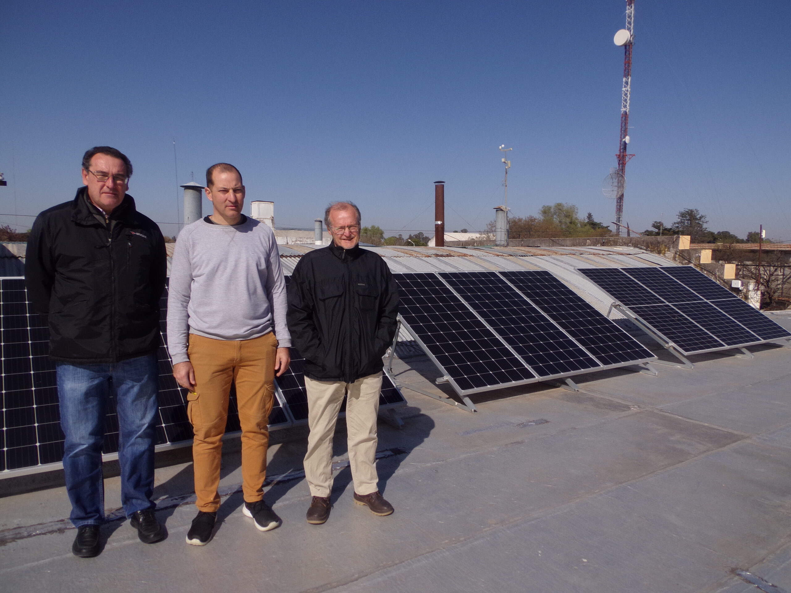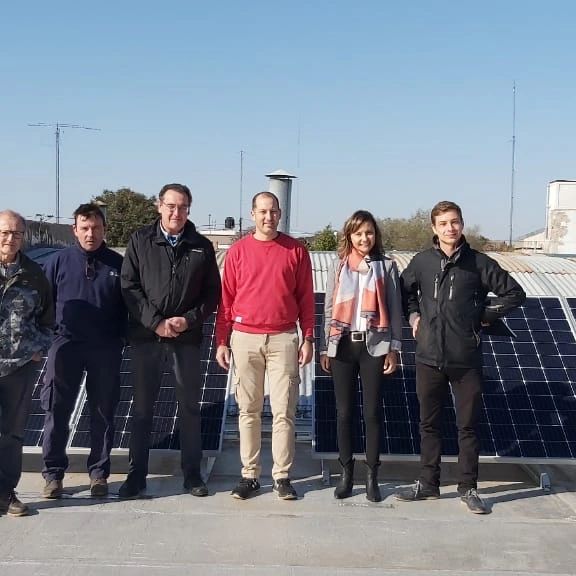 FOTO: Vanina Basso, Lucas Pascua, hijo de Jorge, directivos de la Cosecoba y los paneles solares instalados por el comerciante.