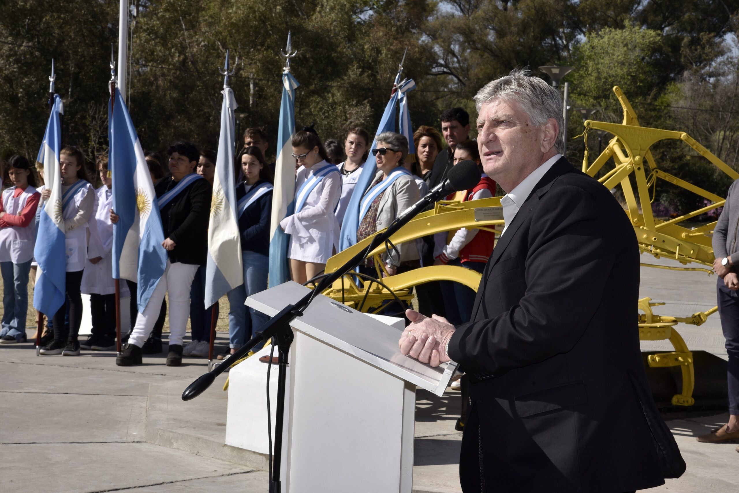 La plaza, que implicó una inversión de ocho millones de pesos, cuenta con un sector de juegos para niños/as y con un monumento central, una trilladora, en memoria de los primeros pobladores.