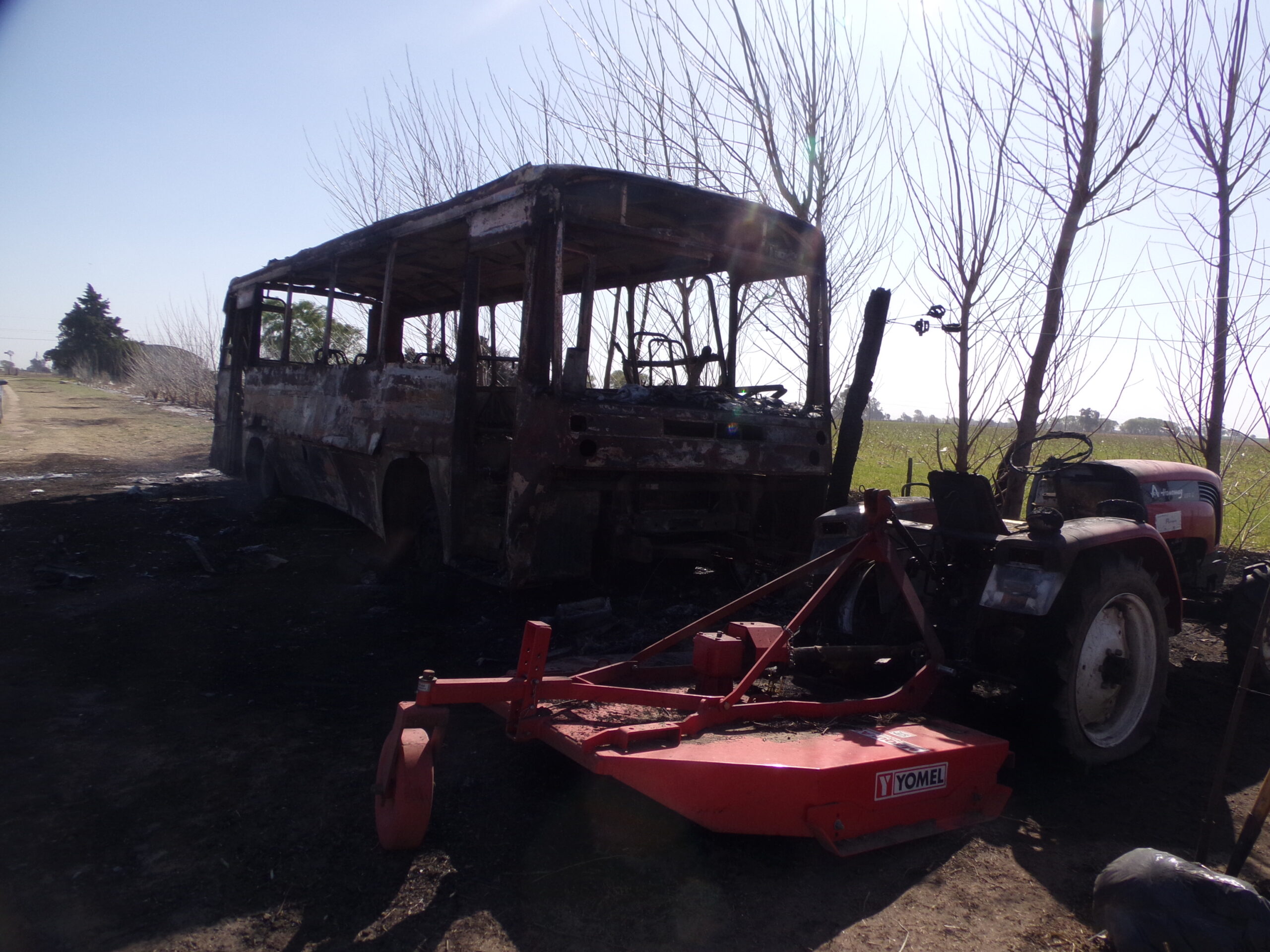 Informados de la emergencia a las 13:20, tres dotaciones con siete bomberos acudieron al predio con una autobomba y dos camionetas equipadas con kits forestales. Desde el cuartel informaron que «cuando llegamos, el colectivo ya estaba ardiendo. Los bomberos que iban en la unidad liviana enseguida empezaron a controlar el fuego que quemaba el pasto al costado del alambrado mientras otro grupo sofocaba las llamas que, en ese momento, rápidamente aumentaban por la acción del viento, consumían un tractorcito» que tenía enganchada una desmalezadora la cual también quedó afectada de manera parcial. Después de una hora de intenso trabajo lograron extinguir el foco ígneo.