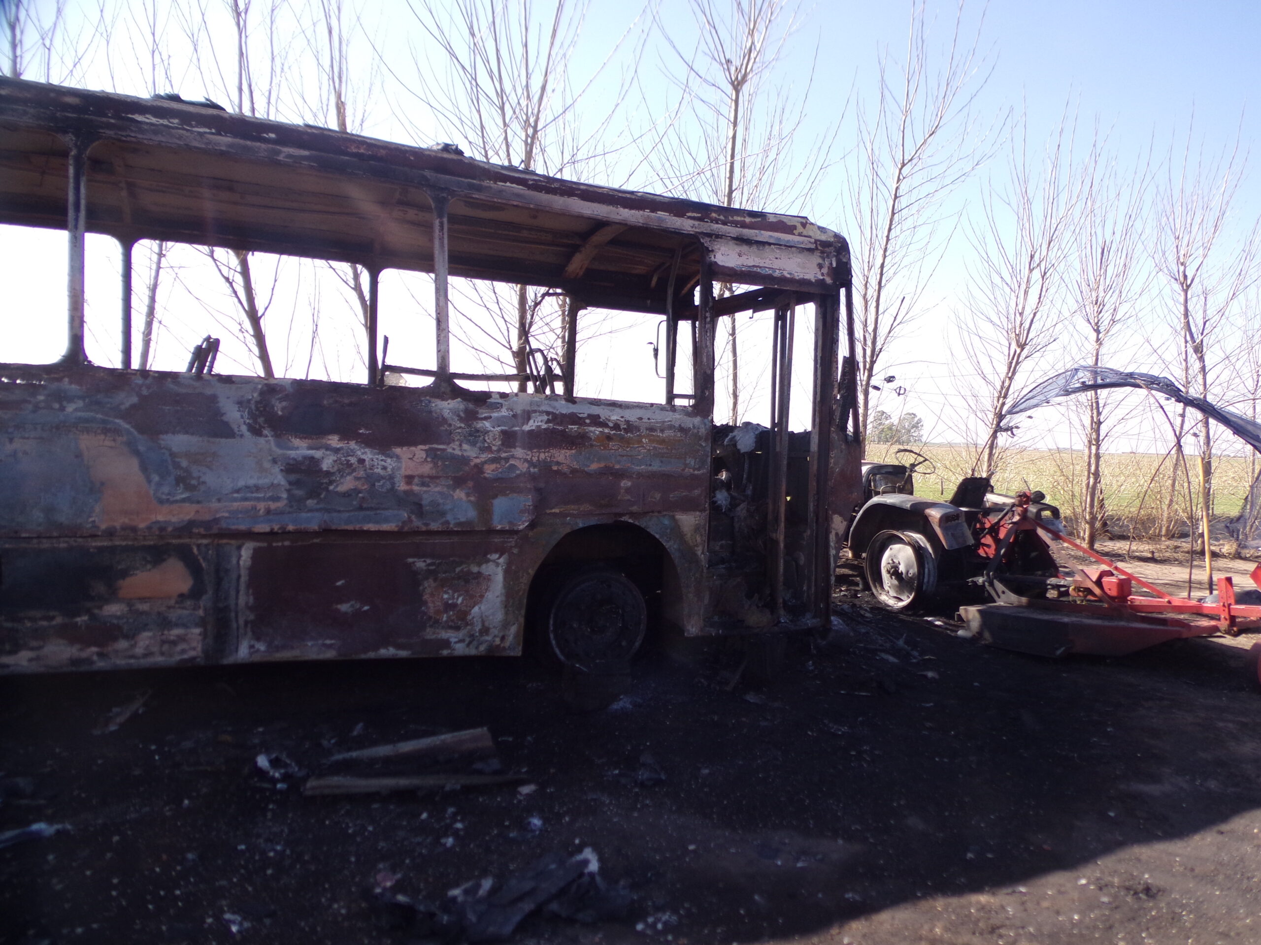 Después del mediodía de hoy, un voraz incendio se desató en un sector de las huertas municipales de Winifreda. A raíz del siniestro, un colectivo que era utilizado como depósito y un tractor nuevo que estaba estacionado adelante del micro quedaron totalmente destruidos, mientras que una desmalezadora terminó dañada parcialmente.