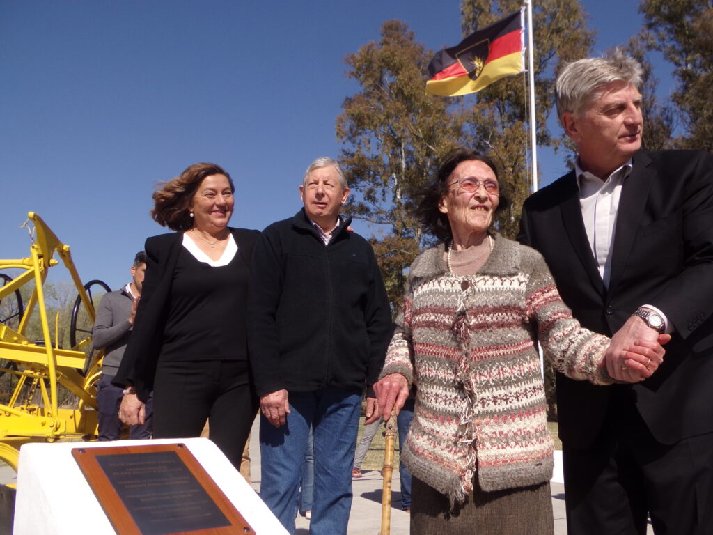 Luego de los discursos, Apolonia, ayudada por sus íntimos, se levantó de la silla, tomó cariñosamente la mano del gobernador Sergio Ziliotto y juntos descubrieron una placa alusiva al acontecimiento. Estuvieron presentes en ese momento la intendenta de Colonia Barón, Sonia Luengo, y Héctor Minig, hijo de Apolonia. De fondo y a lo alto flameaban la bandera argentina y la de los alemanes del Volga. Minig y Ziliotto se conocen desde que eran jóvenes y juntos hicieron la colimba. Hacía mucho tiempo que no se veían y se reencontraron en la Colonia.