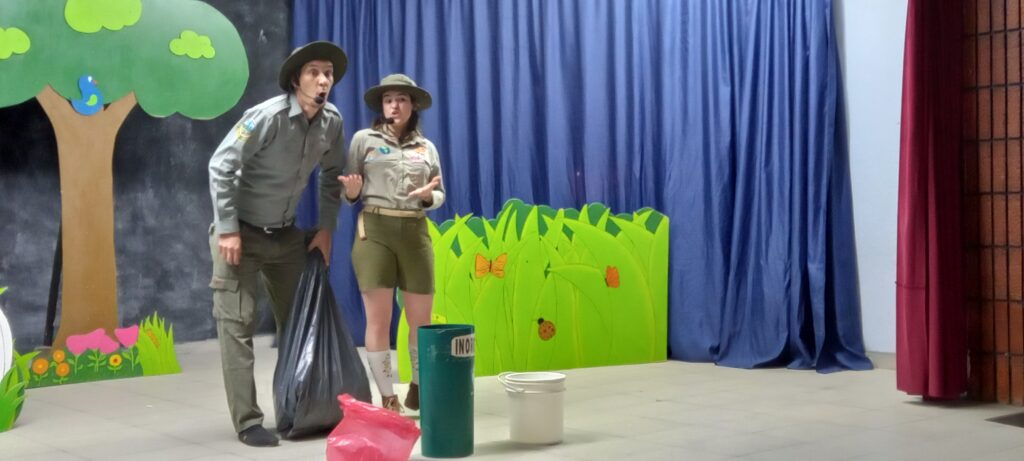 Los artistas ecológicos vestidos con uniformes de guardaparques colocaron sobre el escenario una bolsa roja, dos recipientes plásticos y una bolsa de consorcio. Cuando mostraron distintos residuos, alumnos y alumnas de primero a sexto grado fueron respondiendo dónde debían volcarse. Lo hicieron sin equivocaciones demostrando sus conocimientos en esta materia. “Mono” (rescatado del mascotismo) y “Súper Pancho” (súper héroe) fueron los personajes interpretados por el actor para llamar la atención del público infantil.