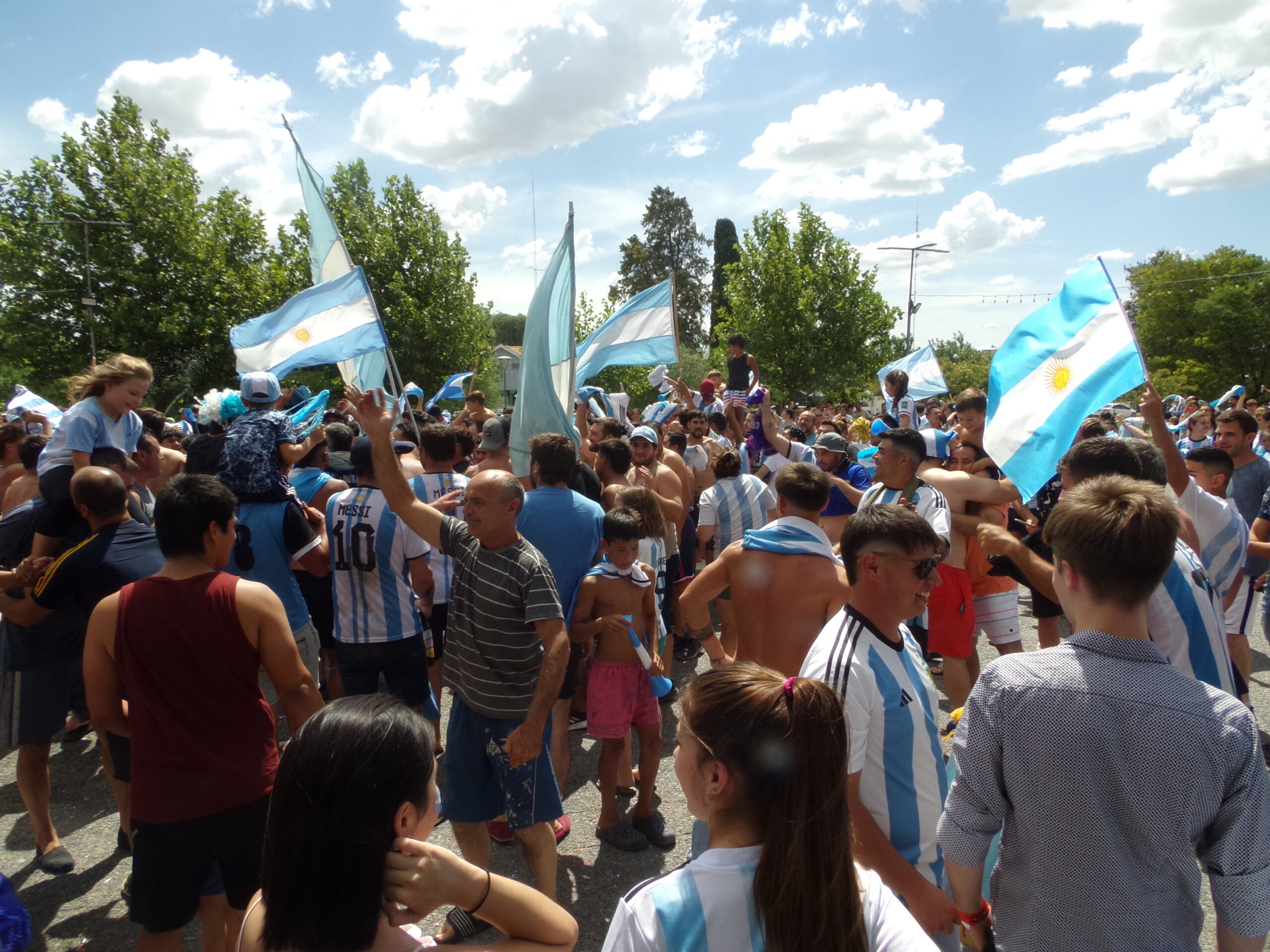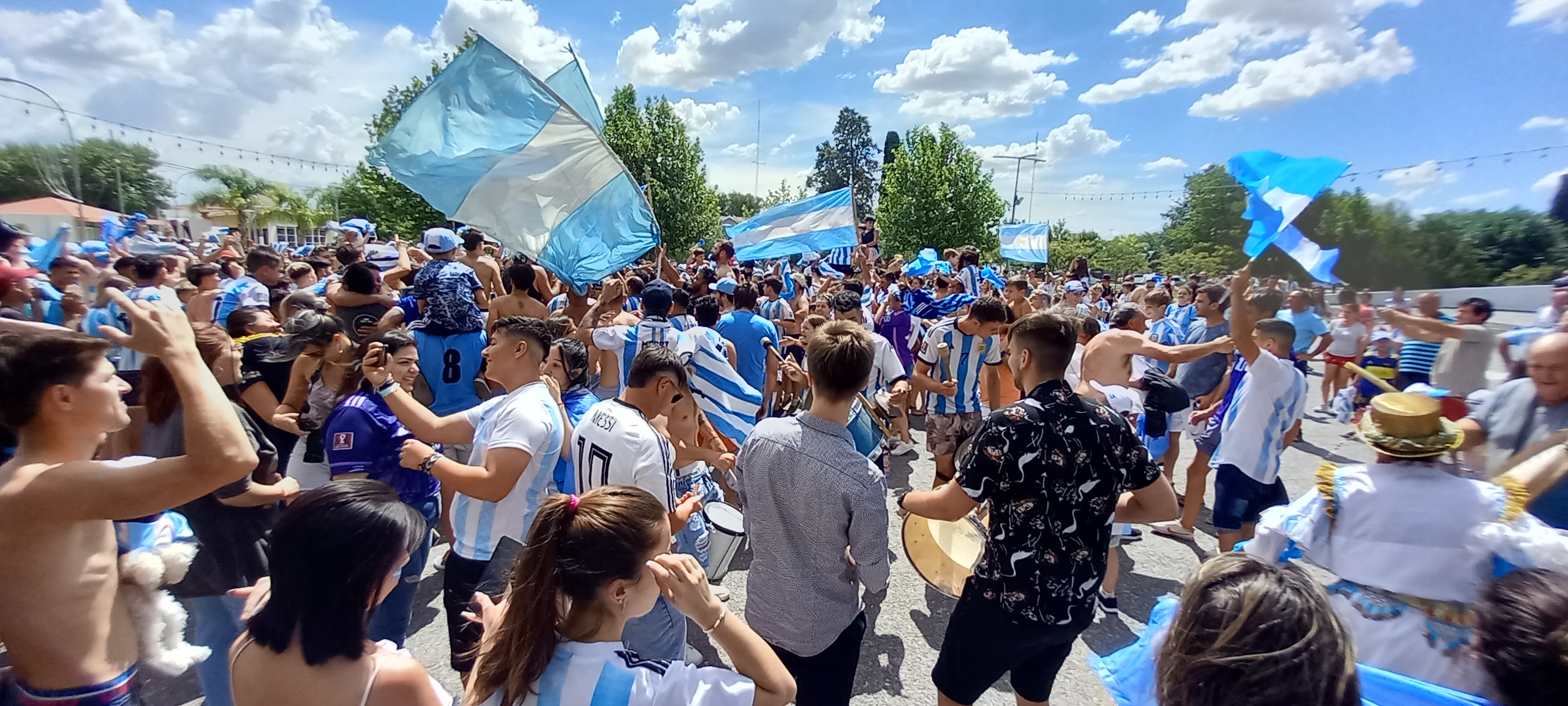 Después, la marea humana confluyó en la plaza San Martín. Allí se desató una verdadera locura, pero de la sana, esa que hace bien al espíritu y al alma. Familias enteras con banderas, vuvuzelas, cornetas, espuma de carnaval, bombos, saltaban, cantaban y bailaban al ritmo de distintas versiones pegadizas del tema musical “Muchachos”, el éxito viral que los pampeanos también adoptamos para alentar a la selección.