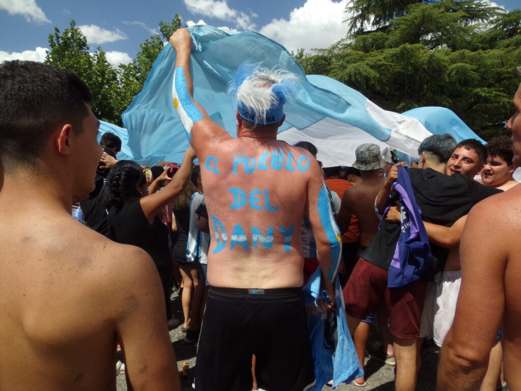 Una multitud de winifredenses vestidos con los colores celeste y blanco invadieron las calles y colapsaron la plaza San Martín luego de que Argentina levantara este domingo la tercera Copa del Mundo de su historia al ganarle a Francia en la final del Mundial de Qatar 2022. Uno de los hinchas tenía pintada en su espalda la leyenda “El Pueblo del Dani” en referencia a Daniel Martínez, el médico winifredense del seleccionado mayor. El profesional hoy también levantó el trofeo más deseado del planeta.