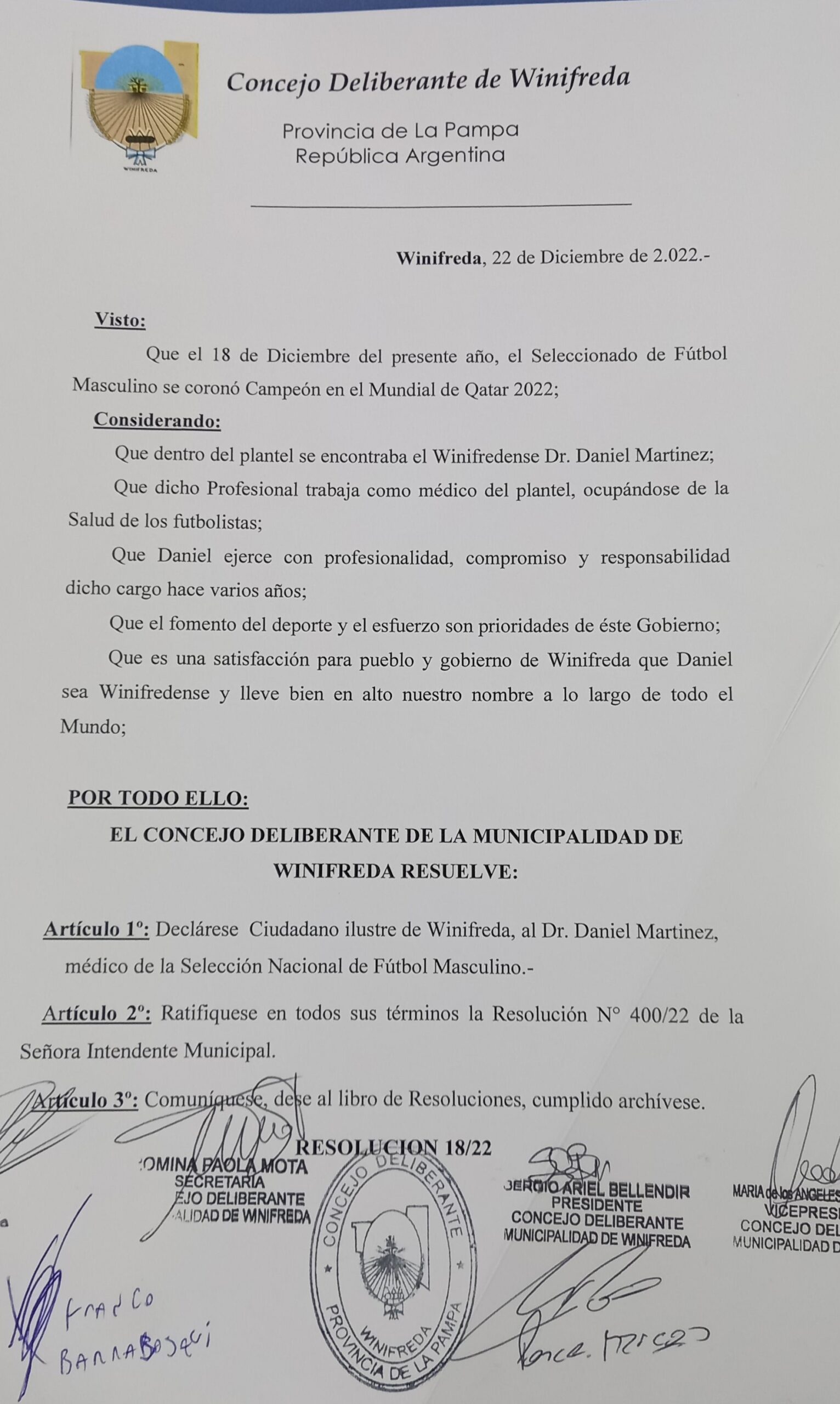 En este sentido, el documento fundamenta que «el 18 de diciembre el Seleccionado de fútbol masculino se coronó Campeón del Mundo en Qatar 2022. Dentro del plantel se encontraba el winifredense Daniel Martínez que trabaja como médico ocupándose de la salud de los futbolistas». Además, resalta que «Daniel ejerce con profesionalidad, compromiso y responsabilidad dicho cargo desde hace varios años». Indica que «el fomento del deporte y el esfuerzo son prioridades de este gobierno municipal». «Es una satisfacción para el pueblo y esta gestión que Daniel sea winifredense y lleve bien en alto nuestro nombre lo largo de todo el mundo», finaliza. La parte resolutiva lo declara «Ciudadano Ilustre».