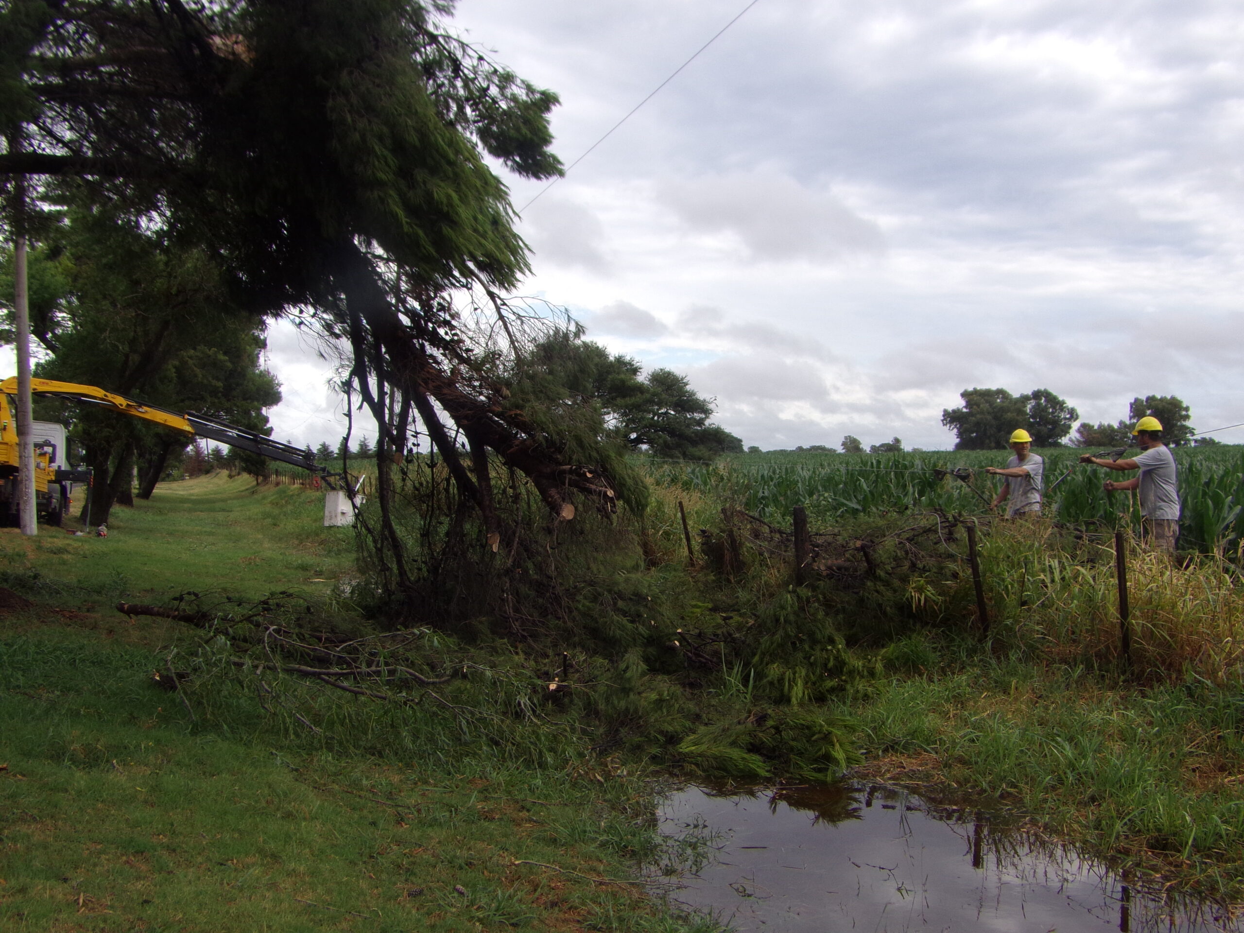 Hubo un corte de luz generalizado por la caída de una fila de eucaliptos sobre la red eléctrica. Uno de los sectores más afectados fue el tendido del acceso oeste. Los cables cortados cayeron sobre una plantación de maíz. Los operarios de redes de la cooperativa ingresaron al campo para tensarlos y devolverlos al tendido original. Otras cuadrillas se movilizaron hacia los campos donde se registraron una importante cantidad de postes y cables caídos. Varios postes de madera de la empresa Telefónica de Argentina se resquebrajaron y terminaron ladeados con los cables muy cerca de veredas, calles y casas.