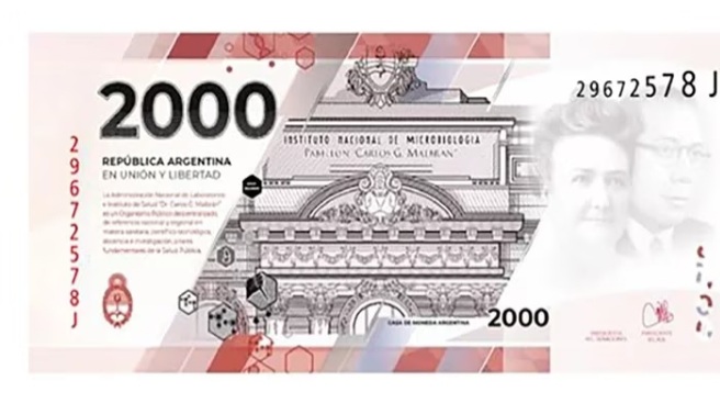 El nuevo billete de 2.000 pesos, aprobado este jueves 2 de febrero por el directorio del Banco Central de la República Argentina, tendrá como imágenes centrales «al Instituto Malbrán, y a la Dra. Cecilia Grierson y al Dr. Ramón Carrillo, precursores en el desarrollo de la medicina en nuestro país», según explicó la entidad en un comunicado. Se calcula que estará en circulación entre junio y julio de 2023.
