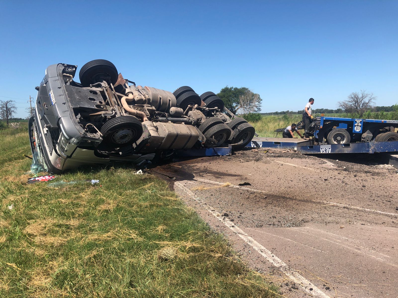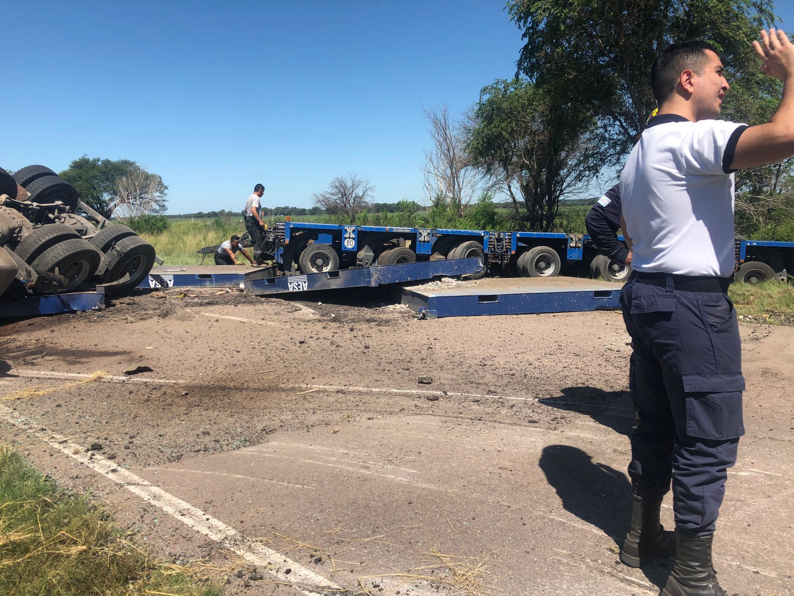 Enterados de la situación, equipos de emergencia llegaron al lugar. Encontraron al camionero dolorido. Había podido salir del habitáculo por sus propios medios. Tras una rápida observación detectaron que se estaba derramando gasoil por los dos tanques de combustible del rodado que permanecía de costado. Los vapores que se esparcían por el ambiente podían generar una explosión ante el intenso calor que hacía. Para evitarla, los bomberos con palas hicieron canales en una de las banquinas para que el líquido inflamable fluya hacia esas zanjas. Policías implementaron un perímetro de seguridad a 100 metros de distancia del siniestro vial, hacia el este y el oeste. El tránsito estuvo interrumpido.