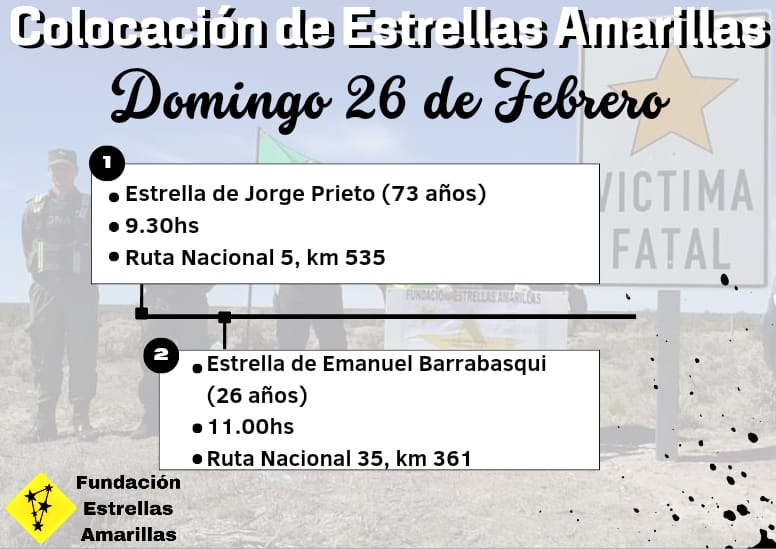 La entidad precisó que la jornada comenzará alrededor de las 9:30 en el kilómetro 535 de la ruta nacional 5, entre las localidades de Lonquimay y Catriló. En ese lugar se colocará el cartel con la Estrella Amarilla en homenaje a Jorge Prieto de 73 años, quien el 26 de febrero de 2022 perdiera la vida tras un choque frontal entre automóviles. La víctima fatal manejaba un auto que fue colisionado por otro que conducía un lonquimayense (34), el cual dio positivo en el test de alcoholemia.