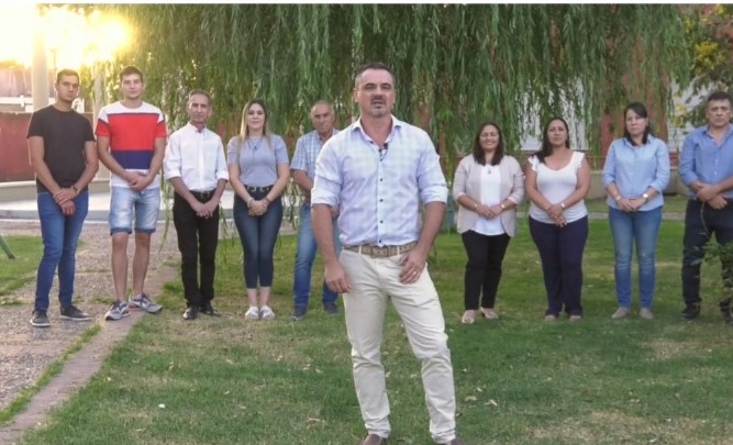 Detrás de él, se ubican las/os postulantes a concejales y al Juzgado de Paz, todos afiliados o simpatizantes del radicalismo a excepción de una sanitarista que milita en el PRO. En el final del video sus rostros aparecen en primer plano junto a sus nombres. Toda la publicación dura 58 segundos.