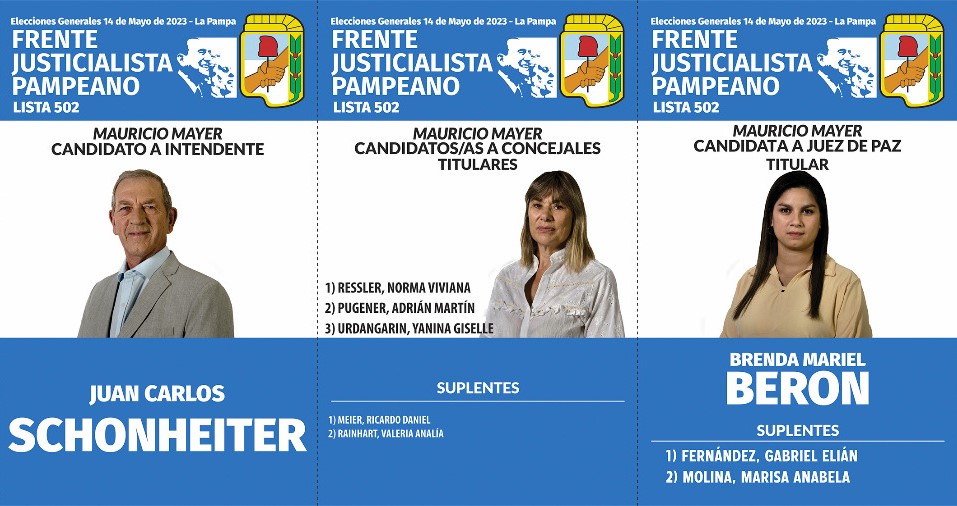 Su compañera de fórmula y candidata a primera concejal es Norma Viviana Ressler, secretaria administrativa del CD. La vecina es nativa de Winifreda, pero está radicada en Mayer. Los demás postulantes a concejales titulares son Adrián Martín Pugener y Yanina Giselle Urdangarin. Como Suplentes están Ricardo Daniel Meier y Valeria Analía Rainhart. La candidata al cargo de Jueza de Paz es Brenda Mariel Berón acompañada por Elián Gabriel Fernández y Marisa Anabela Molina como suplentes. Cuentan con el respaldo del gobernador Sergio Ziliotto, quien va por su reelección, y la candidata a vicegobernador Alicia Susana Mayoral.