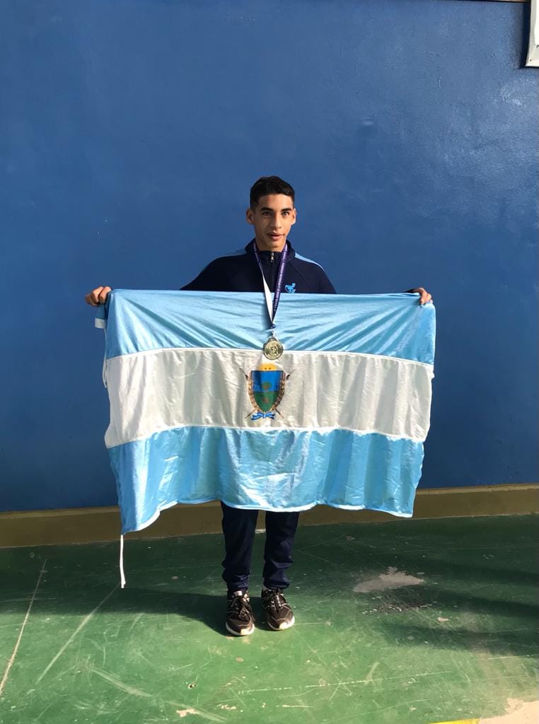 Alexander Yurk muestra su medalla de oro con la bandera de La Pampa.