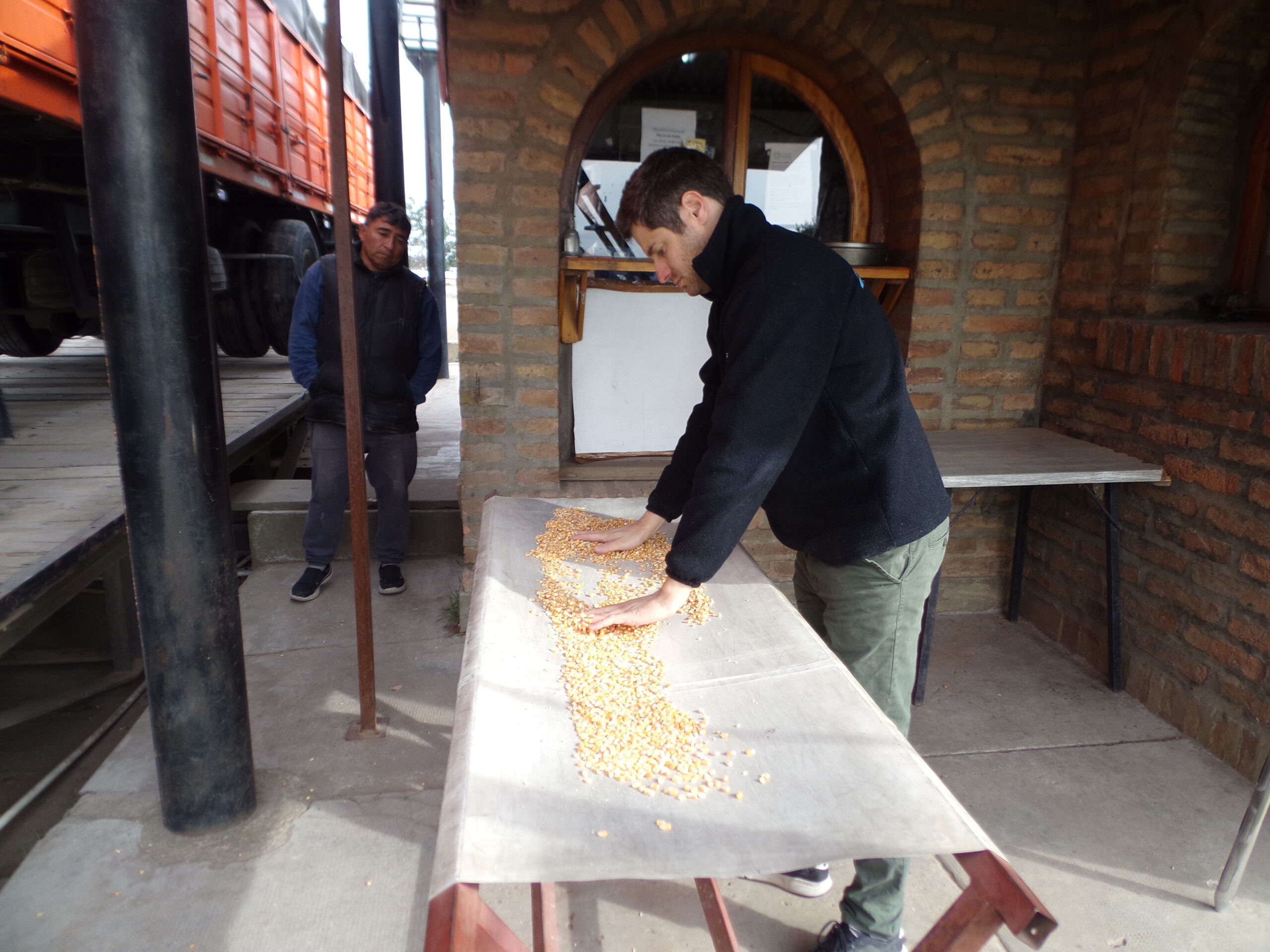 Una vez cargados, «pasan por la balanza, son calados, las muestras de maíz se vuelcan sobre un catre y se verifica la ausencia de olores, insectos vivos y materias extrañas (suciedad, malezas y demás). Si está todo OK se emiten los certificados fitosanitarios», amplió. En otro sector, un empleado de la planta mide el porcentaje de humedad de los granos con un humedímetro.