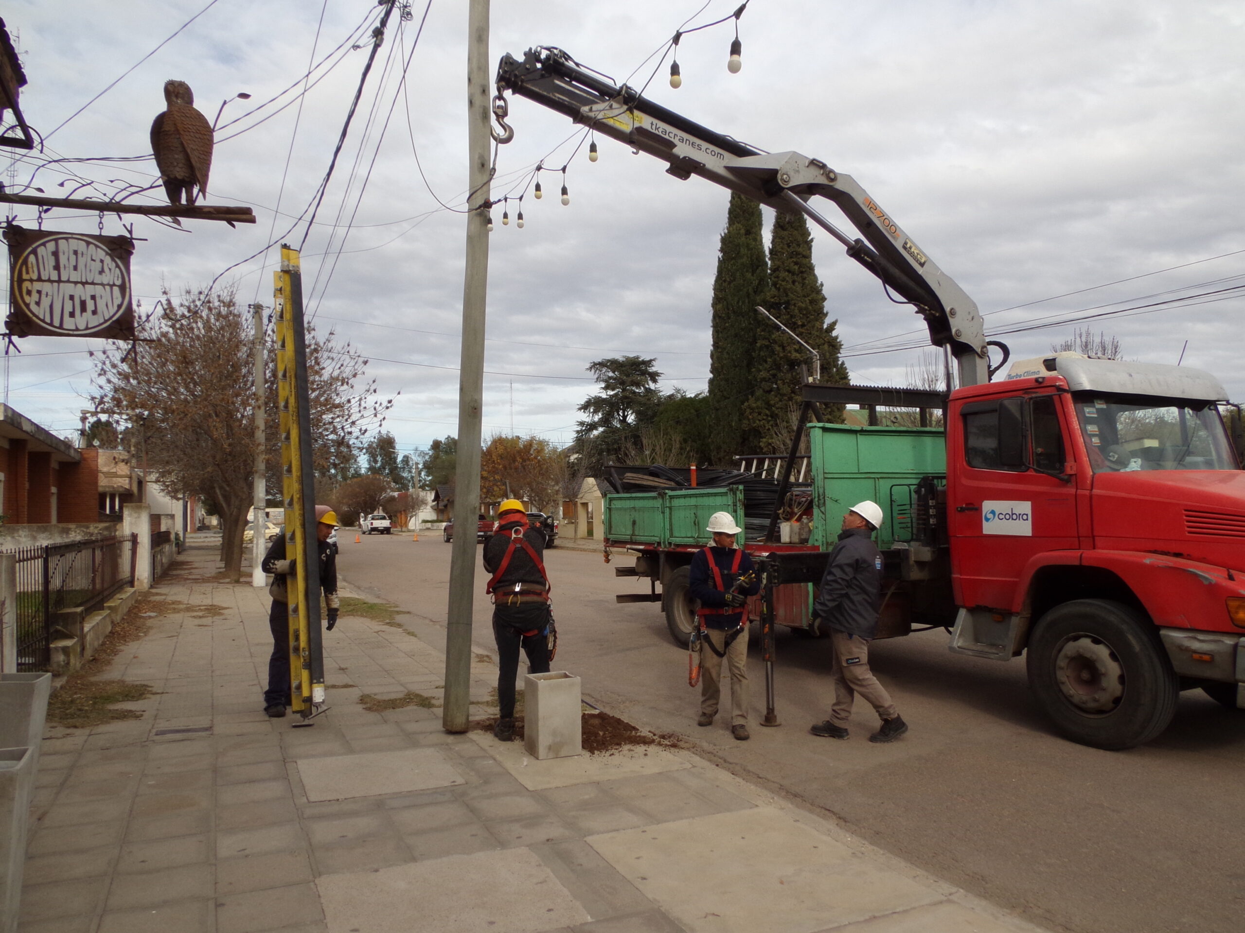 «Somos cinco personas trabajando y las herramientas que utilizamos son una grúa, pértigas, escaleras y demás. Además, tenemos que tener mucho cuidado con la corriente eléctrica, por eso estamos en contacto permanente con la cooperativa de Winifreda que nos está dando una mano para realizar cortes de energía cuando los necesitamos, eso es algo primordial para evitar riesgos e inconvenientes», señaló el entrevistado.
