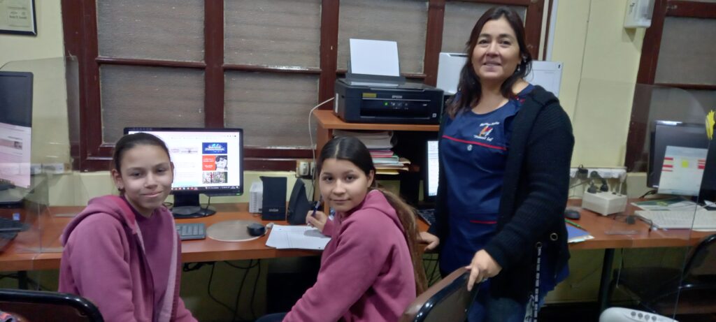 Foto: Elcira López con lectoras en la biblioteca donde se exhibirán los libros comprados en feria internacional.