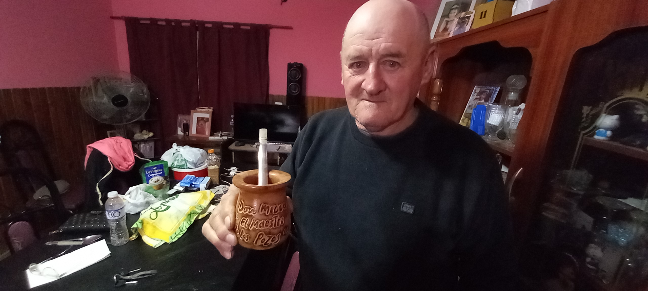 Un cliente, además de pagarle por su trabajo, le regaló un mate de madera con una dedicatoria tallada que dice “Don Miguel, el maestro de los pozos”.