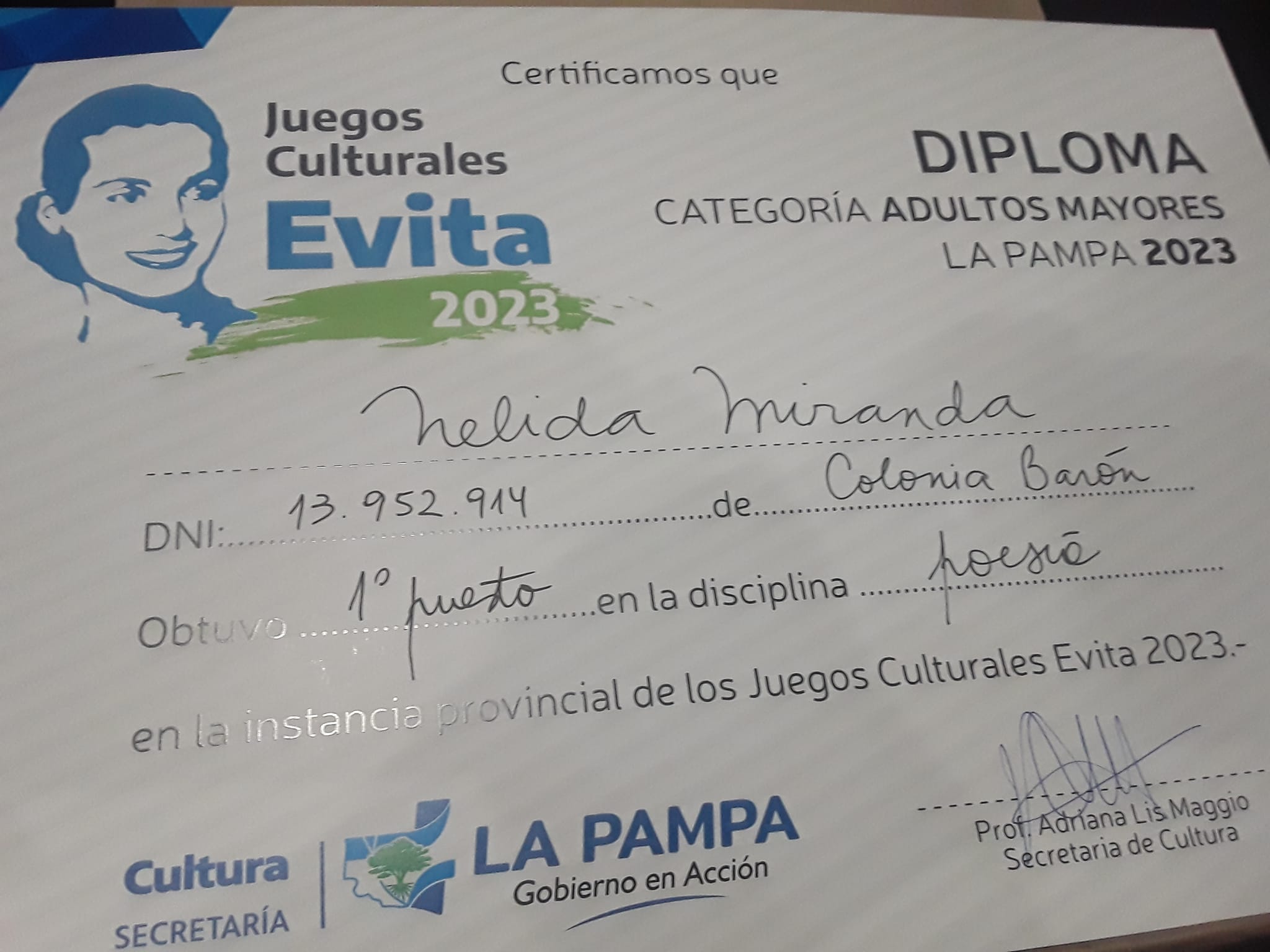 Recibió su diploma en un acto que tuvo lugar hace unos días en el Centro Cultural Medasur de Santa Rosa y estuvo presidido por la secretaria de Cultura del gobierno provincial, Adriana Maggio; Paula Boh, directora de Artística y Silvia González, directora de Adultos Mayores.