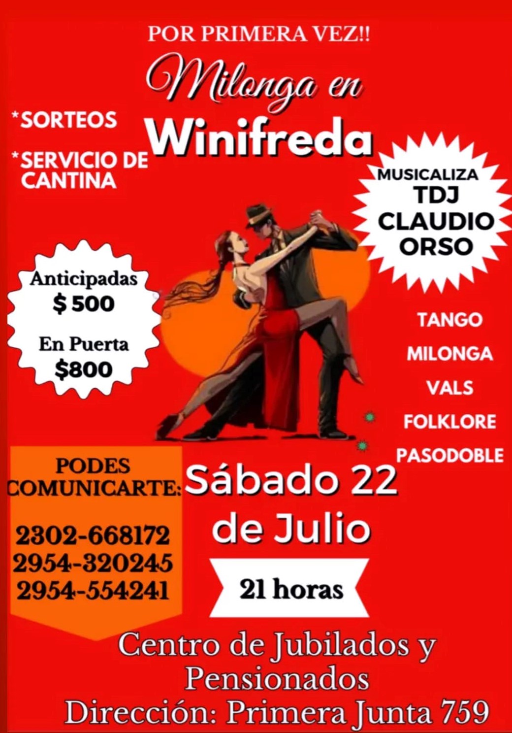 El Taller de Tango que dirige Héctor Luis Di Bin anunció la primera Milonga en Winifreda. El evento tendrá lugar el 22 de julio en el Centro de Jubilados y Pensionados. Esperan la presencia de parejas que bailan al compás del dos por cuatro, milongas, valses, pasodobles, folclore y algunas cumbias.