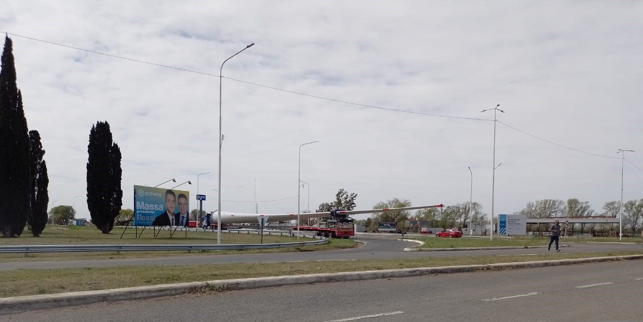 Un camión que transporta una enorme pala para un molino de viento fue visualizado este viernes en el cruce de rutas ubicado frente al arco de entrada y acceso a Winifreda.