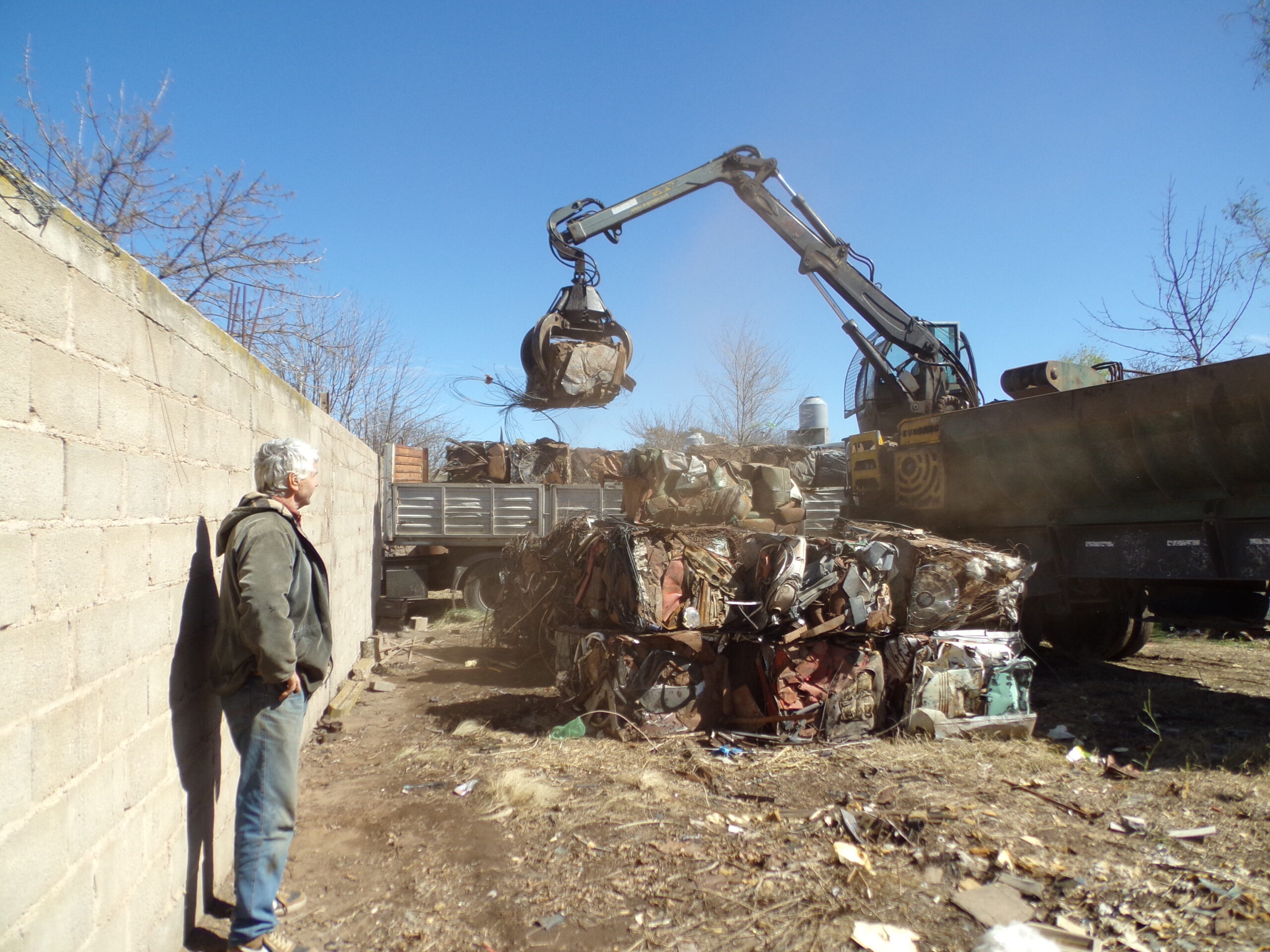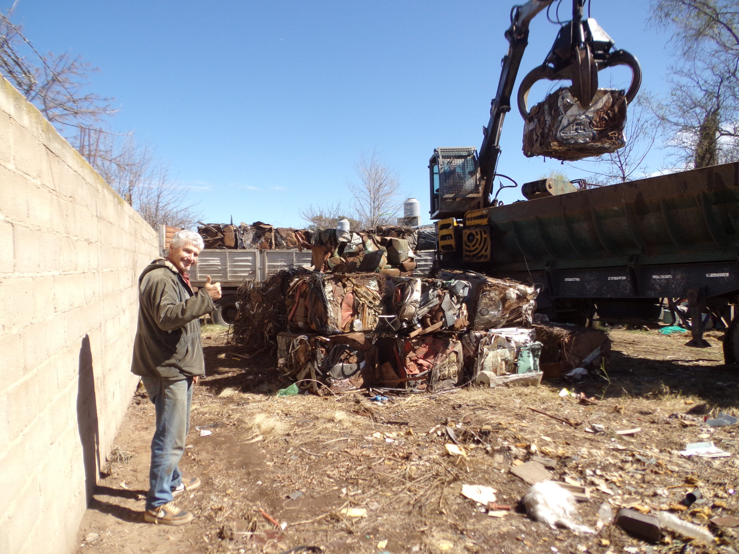 La chatarra estaba depositada y clasificada en un terreno de su propiedad. Hasta allí llegó proveniente de Tandil, provincia de Buenos Aires, una prensadora hidráulica que primeramente realizó el compactado o enfardado de los elementos. Luego, las garras de la máquina levantaron fardos y los colocaron sobre el semirremolque de dos camiones de gran porte.