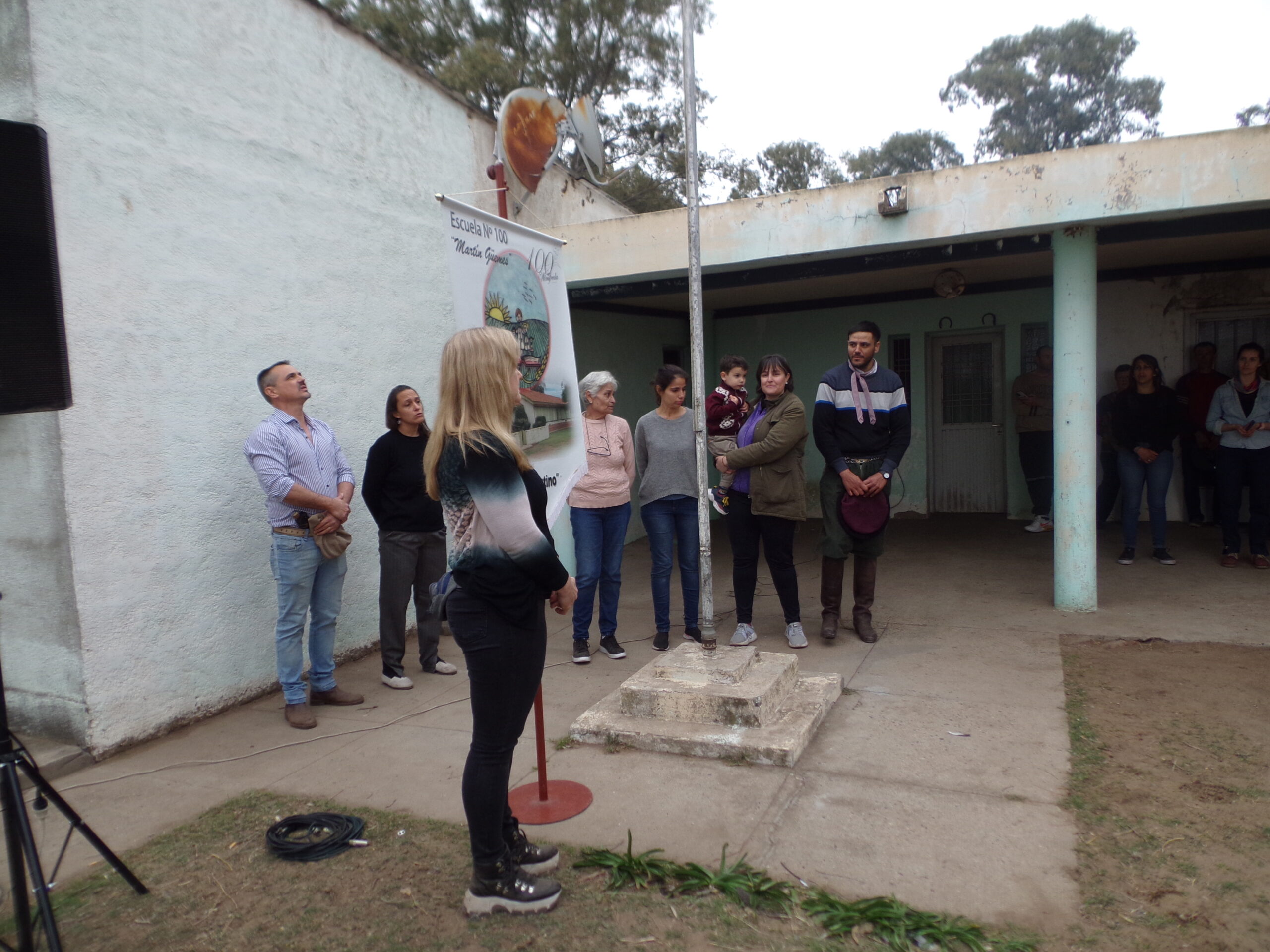En el patio del ex establecimiento educativo tuvo lugar el emotivo acto homenaje a “Cacho” Barón con la presencia de su esposa Mónica Martínez, sus hijas Melina y Rocío, su hijo Javier y sus nietos Ignacio y Jerónimo. La familia fue invitada a izar el pabellón nacional. Luego, recibieron un presente de manos del equipo docente de la Escuela 100.