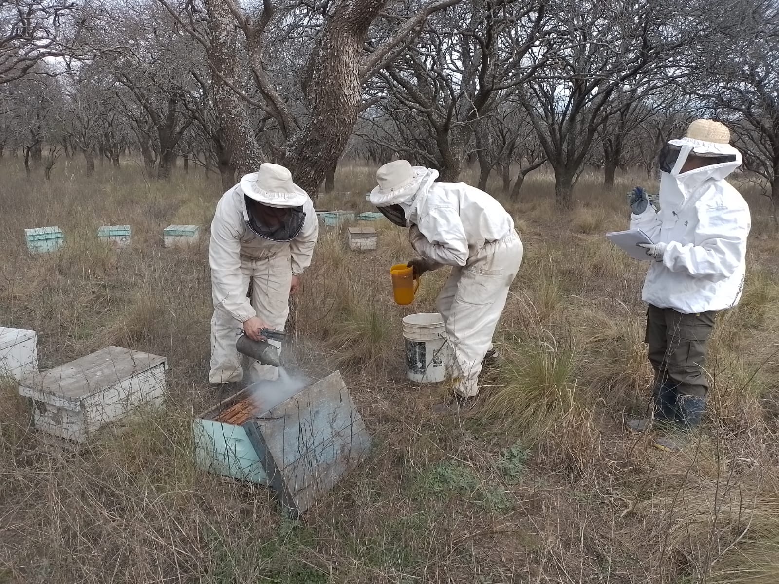 Los apicultores revisan las colmenas en la UDA Caldenal Pampeano.