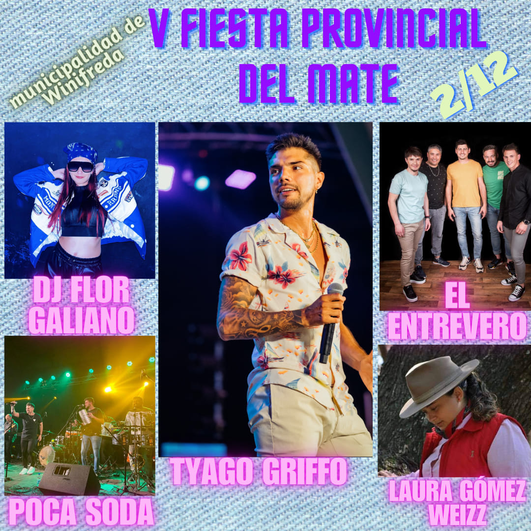 La Municipalidad de Winifreda difundió por sus redes los espectáculos musicales que podrán disfrutarse en la V Fiesta Provincial de Mate prevista para el 2 de diciembre en el vivero municipal Ernesto Lucero donde se encuentran emplazados el Parque Acuático y el tanque con hidromasajes.