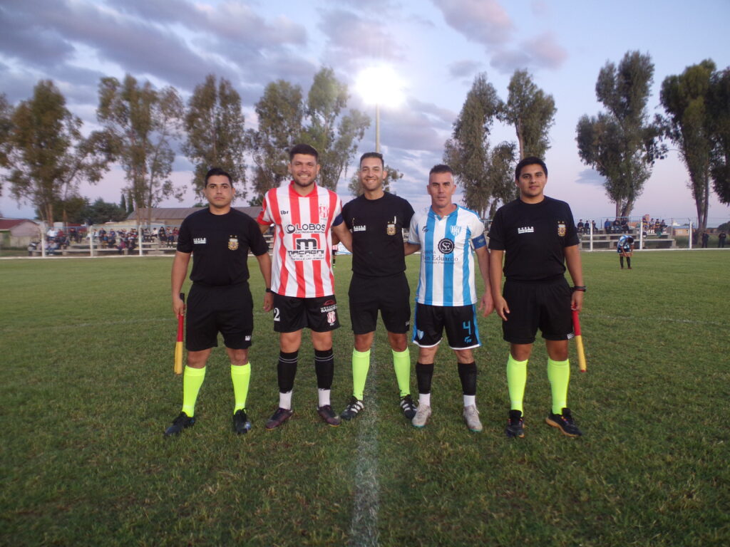 Foto: Capitanes de ambos equipos con árbitros cuando jugaron en Winifreda.