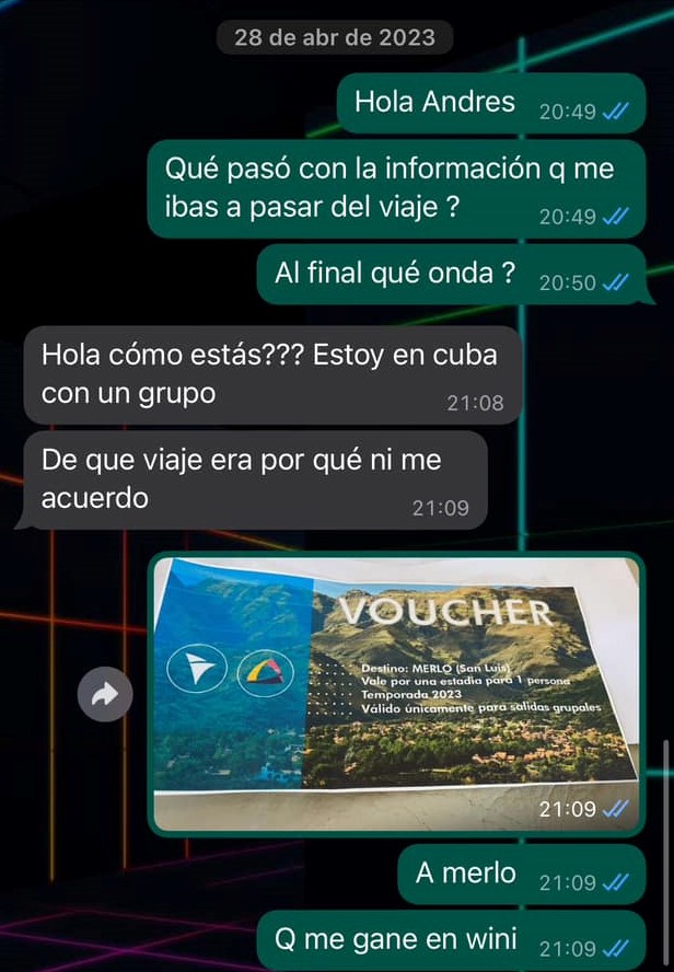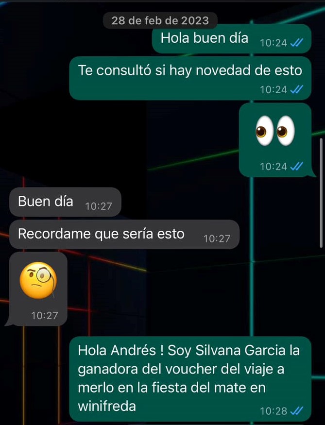 Aún conserva las capturas de pantallas de los mensajes que le envió al contacto de la empresa pampeana y las respuestas que recibió. Incluso las publicó en redes. «En tres o cuatro oportunidades le pregunté qué pasaba con el viaje, me respondió que era para la temporada 2023, que me quedara tranquila que no lo iba a perder, pero el tiempo pasó y ya se hizo otra fiesta del mate. Le pedí que me pasara fechas para viajar y precio para la otra persona. Insistí una, dos, tres veces y nunca me contestó», continuó.